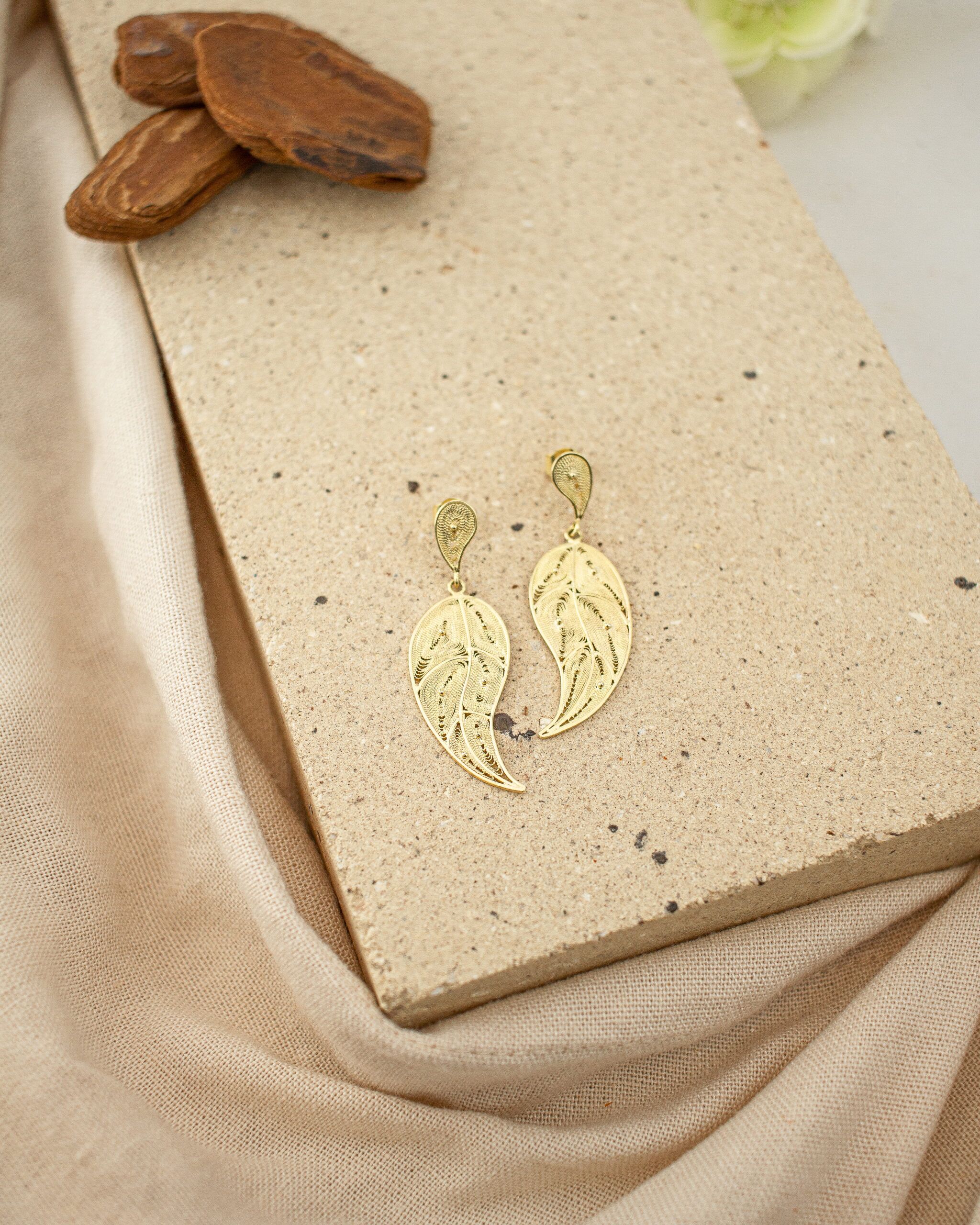 O design da folha, com traços intricados, combina elegância natural e exclusividade, ideal para quem busca uma joia única com alma cultural. Leve, versátil e atemporal, este par de brincos é perfeito para ocasiões especiais ou para adicionar um toque de charme cultural ao dia a dia. Ao escolhê-lo, você leva mais do que uma joia – você abraça uma história de cuidado, paixão e sustentabilidade.