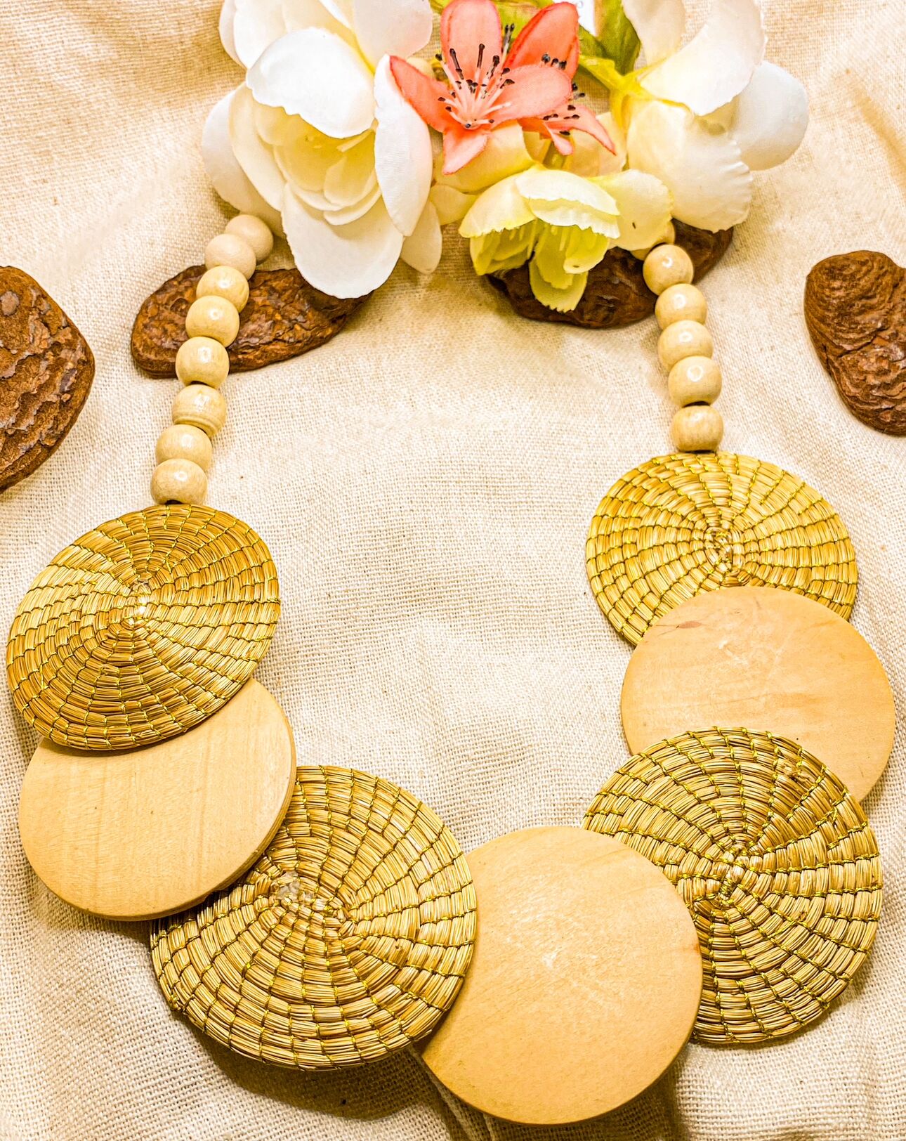 O capim dourado, conhecido como o “ouro do cerrado”, é colhido de forma sustentável nas veredas do Jalapão e combinado com madeira natural para criar um colar com pingentes em forma de mandalas. Este design simboliza harmonia e conexão, unindo a rusticidade do capim dourado com a textura orgânica da madeira, resultando em uma peça cheia de significado e elegância.
