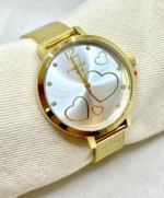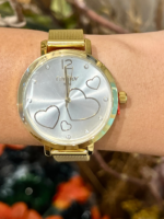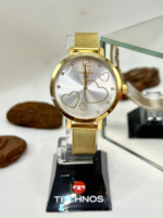 O relógio apresenta caixa de 38 mm em metal, com acabamento dourado, oferecendo presença equilibrada no pulso sem perder a leveza visual. Sua pulseira em aço inoxidável dourado, com 14 mm de largura, proporciona conforto e durabilidade no uso diário, enquanto o fecho tipo gancho garante praticidade no ajuste.