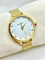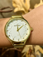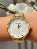O relógio do kit apresenta caixa de 38 mm em metal com acabamento dourado e pulseira em aço, oferecendo equilíbrio entre leveza, conforto e durabilidade. Seu mostrador branco com estampa floral e detalhes dourados reforça a identidade da linha Mimos e Sutilezas, trazendo feminilidade e suavidade ao design.