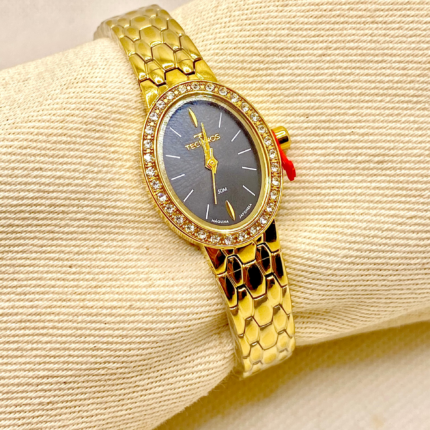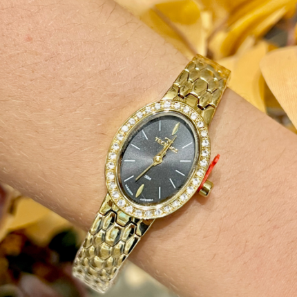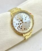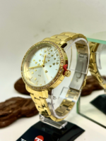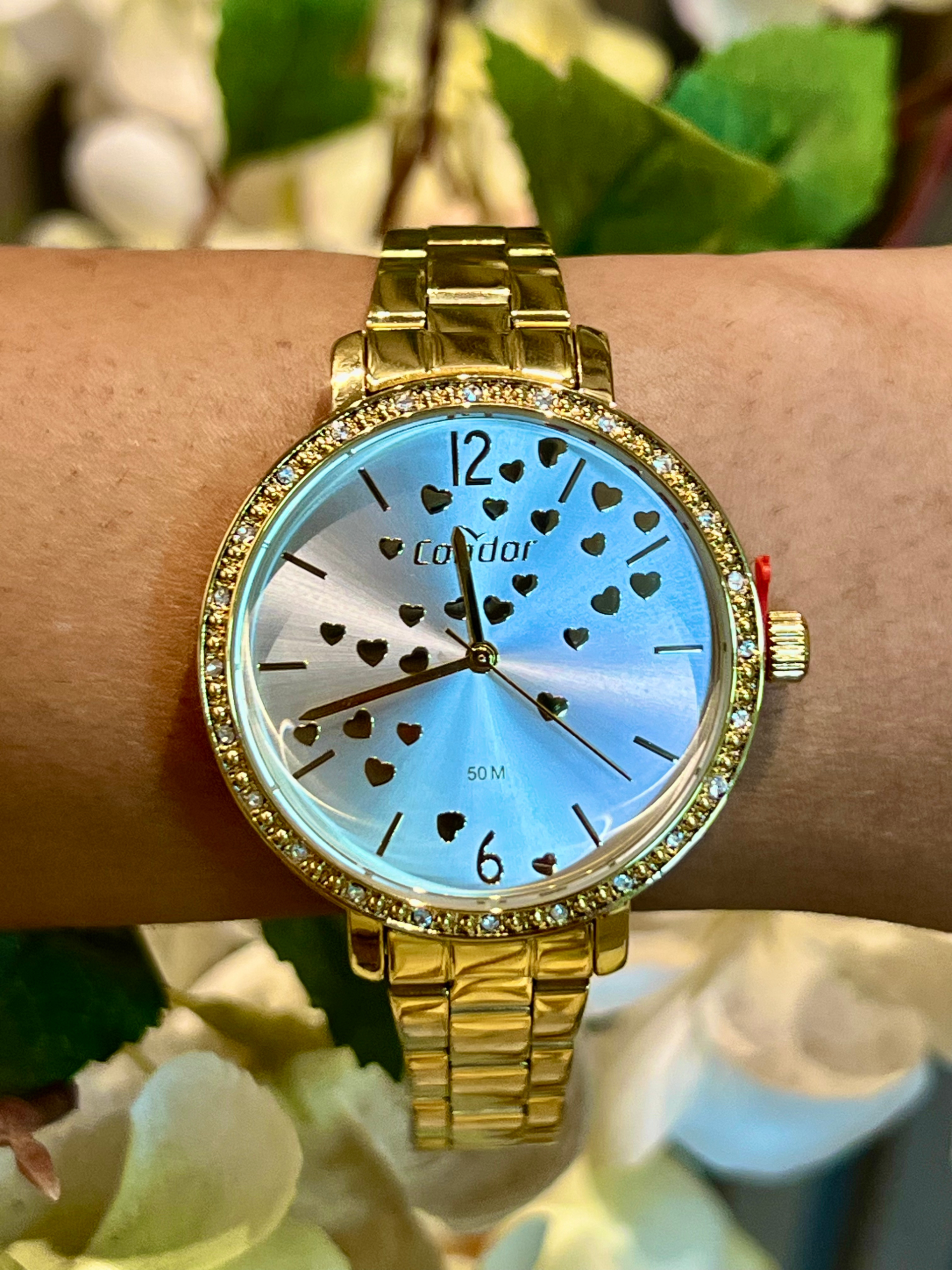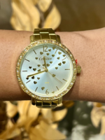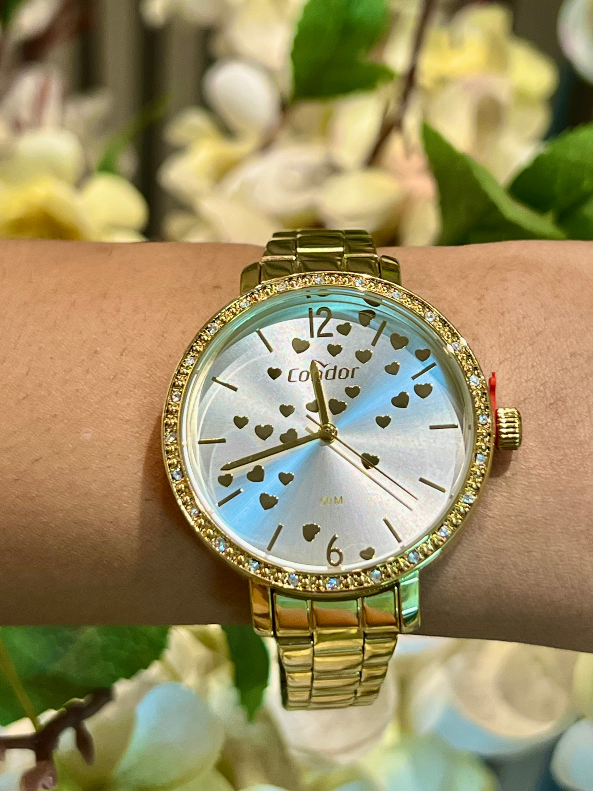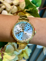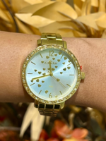 O relógio apresenta caixa e pulseira douradas em aço inoxidável, garantindo durabilidade e um acabamento sofisticado. Seu mostrador prateado cria um contraste elegante, mantendo uma leitura clara e agradável das horas. O funcionamento analógico com movimento quartz oferece precisão e praticidade no uso diário.