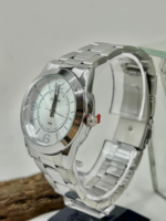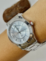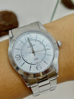 Sua caixa redonda de 35,5 mm, produzida em metal com banho prateado, oferece proporção equilibrada e confortável no pulso. O mostrador prata com visual limpo proporciona excelente leitura das horas, tornando o modelo ideal para o uso diário.