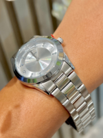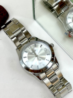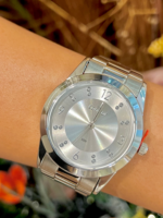 Sua caixa de 35,5 mm em metal com acabamento prateado apresenta tamanho médio, oferecendo excelente visibilidade sem perder a delicadeza no pulso. O mostrador prateado, enriquecido com aplicação de pedras e marcações elegantes, adiciona um toque sofisticado à peça.