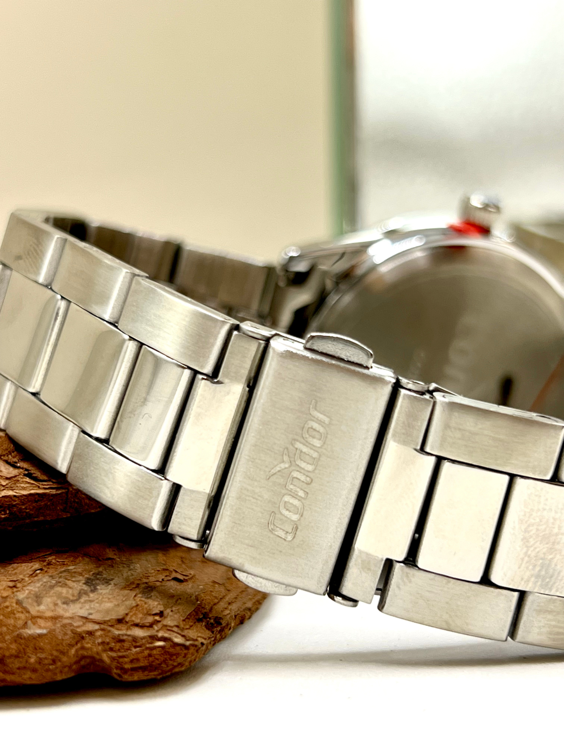 A pulseira em aço inoxidável estilo 3 links, também na cor prata, garante resistência, conforto e um visual atemporal que combina com diferentes produções — do casual ao mais alinhado. O fecho com botão lateral proporciona segurança e praticidade no uso.