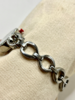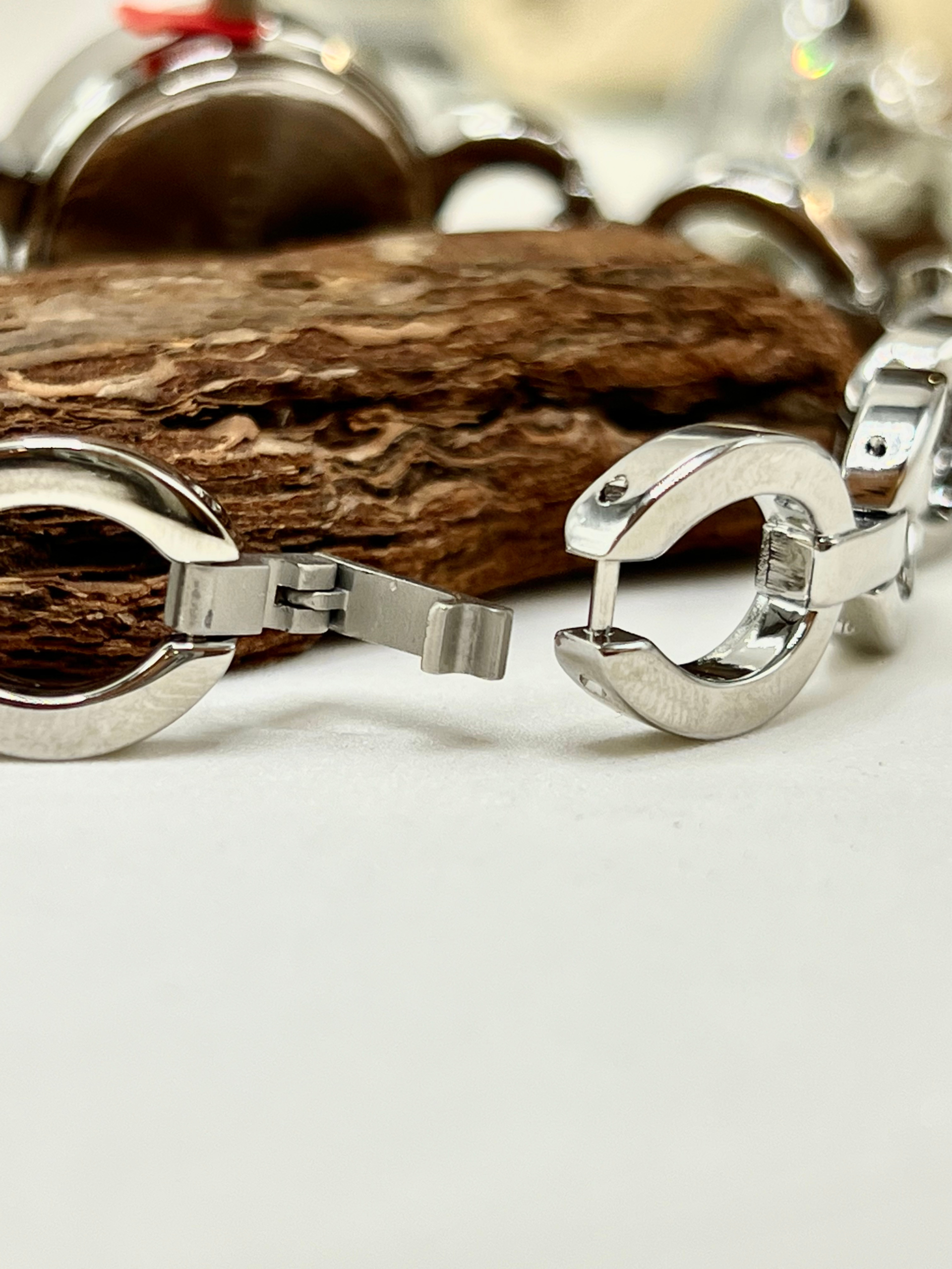 A pulseira em metal sólido estilo bracelete, também em acabamento prateado, reforça a proposta elegante do modelo. Seu fecho tipo joia proporciona ajuste seguro e acabamento refinado, valorizando ainda mais o design.