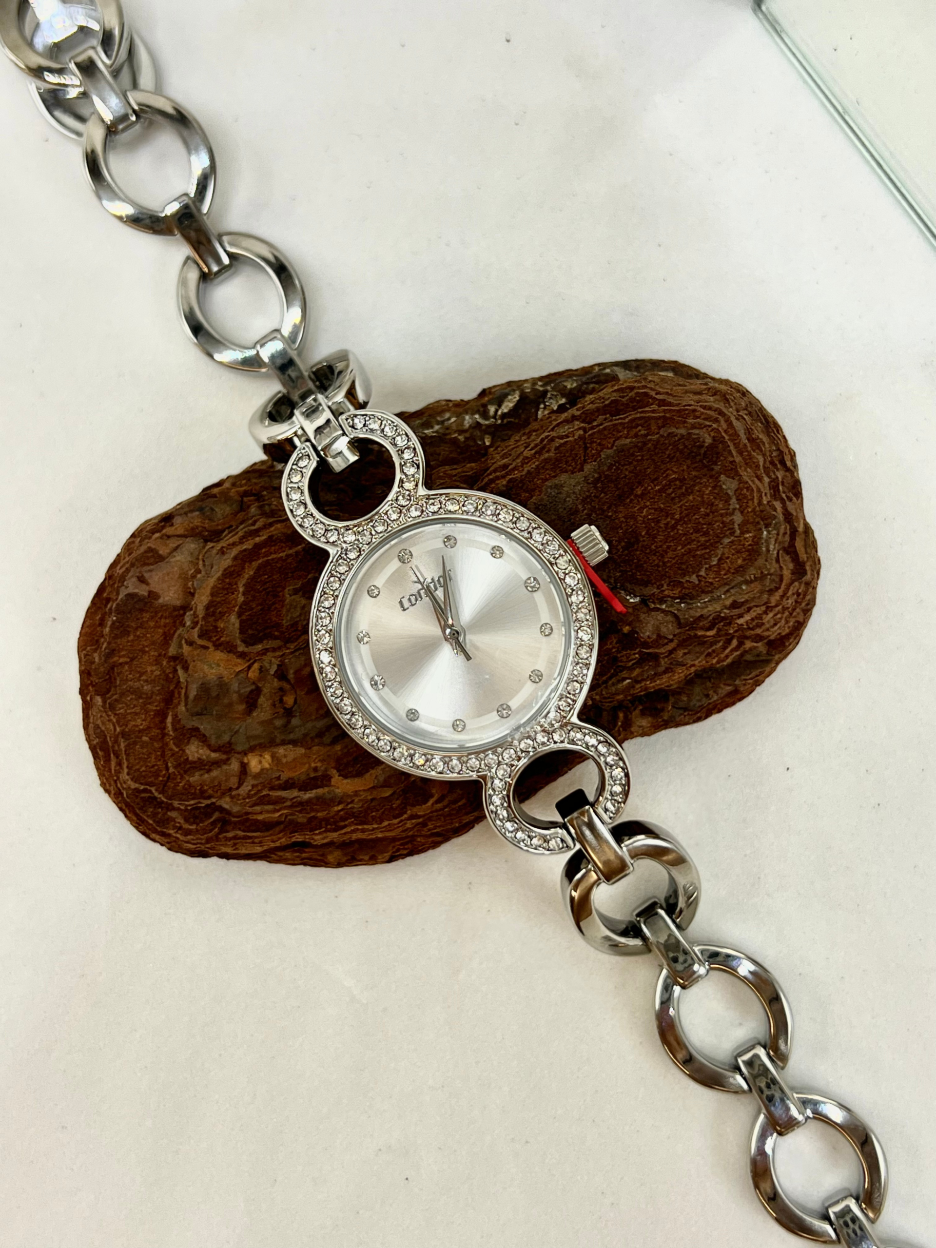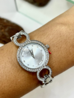 Com caixa de 25 mm em metal com banho prateado, o modelo apresenta proporções compactas e femininas, garantindo leveza e conforto no pulso. O destaque fica por conta do aro com aplicação de pedras e mostrador com brilho, que adicionam charme e sofisticação ao visual.