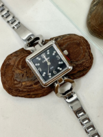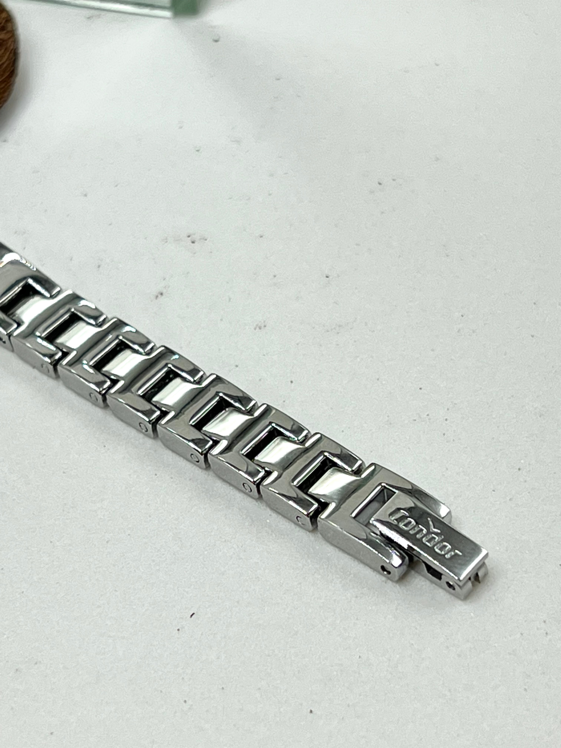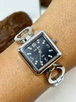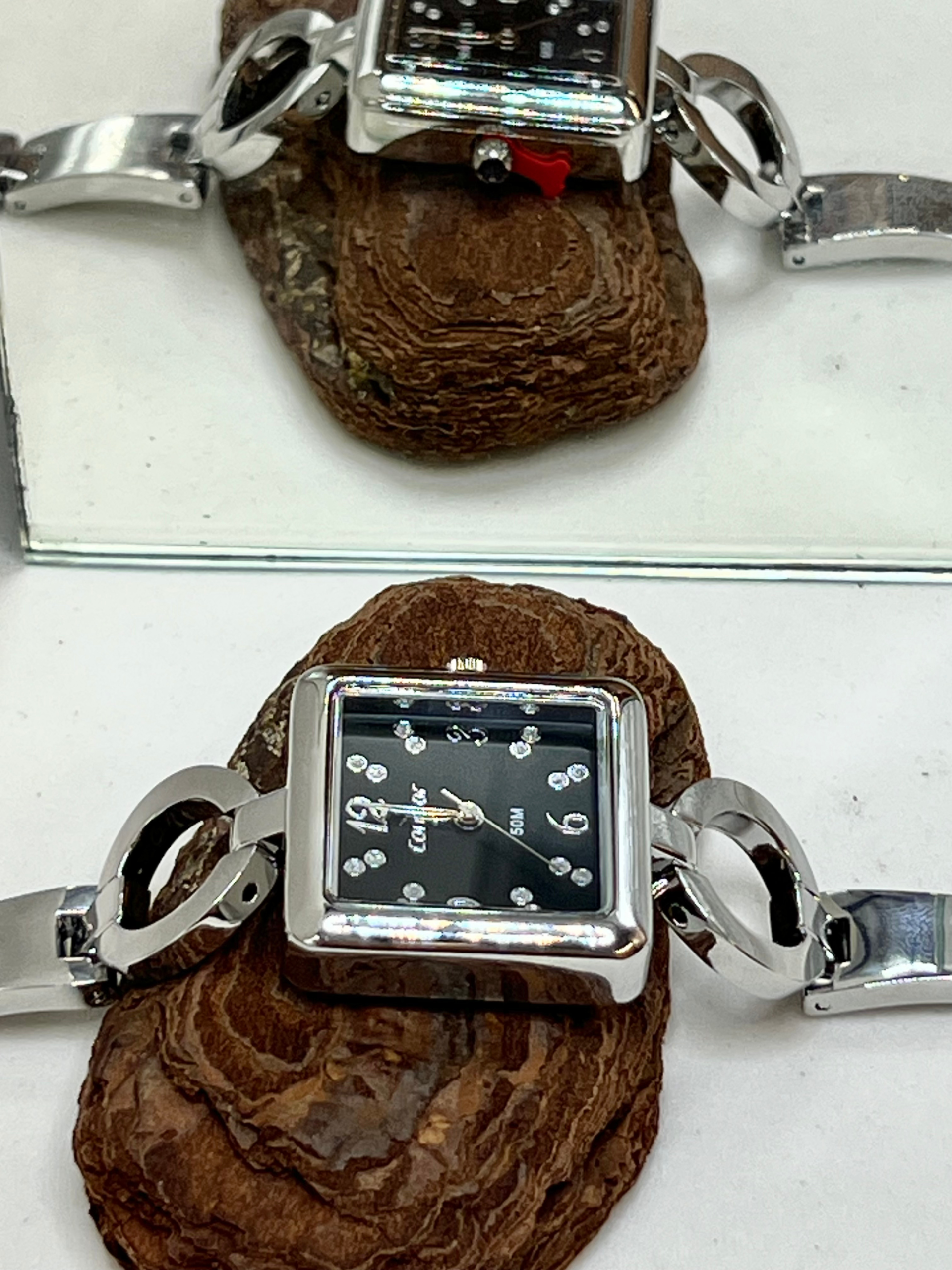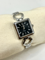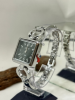 Sua caixa quadrada de 26 mm, produzida em metal com banho prateado, oferece proporções equilibradas e visual contemporâneo. O mostrador preto com aplicação de cristais adiciona brilho e contraste ao modelo, criando um efeito marcante e delicado ao mesmo tempo. O visor em cristal mineral protege o mostrador contra riscos leves do uso diário.