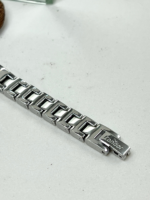 A pulseira em metal sólido estilo bracelete, também em prata, reforça a proposta joia da coleção, proporcionando presença no pulso e excelente conforto. O fecho tipo joia garante segurança e praticidade no fechamento.