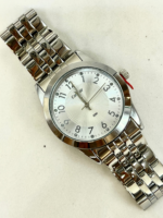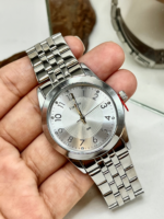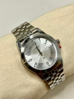 Sua caixa redonda de 35,5 mm, produzida em metal com banho prata, apresenta proporção equilibrada no pulso, garantindo presença sem perder a delicadeza. O mostrador branco com numeração completa facilita a leitura das horas e reforça o visual tradicional do modelo. O vidro em cristal mineral oferece resistência adequada para o uso diário.