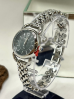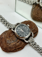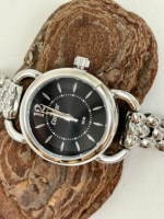 A caixa de 26 mm, produzida em metal com banho prateado, apresenta proporções equilibradas para um visual feminino e discreto. O mostrador preto com aplicação de brilho e pedras (strass) cria um efeito sofisticado e contemporâneo, destacando o relógio no pulso.
