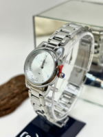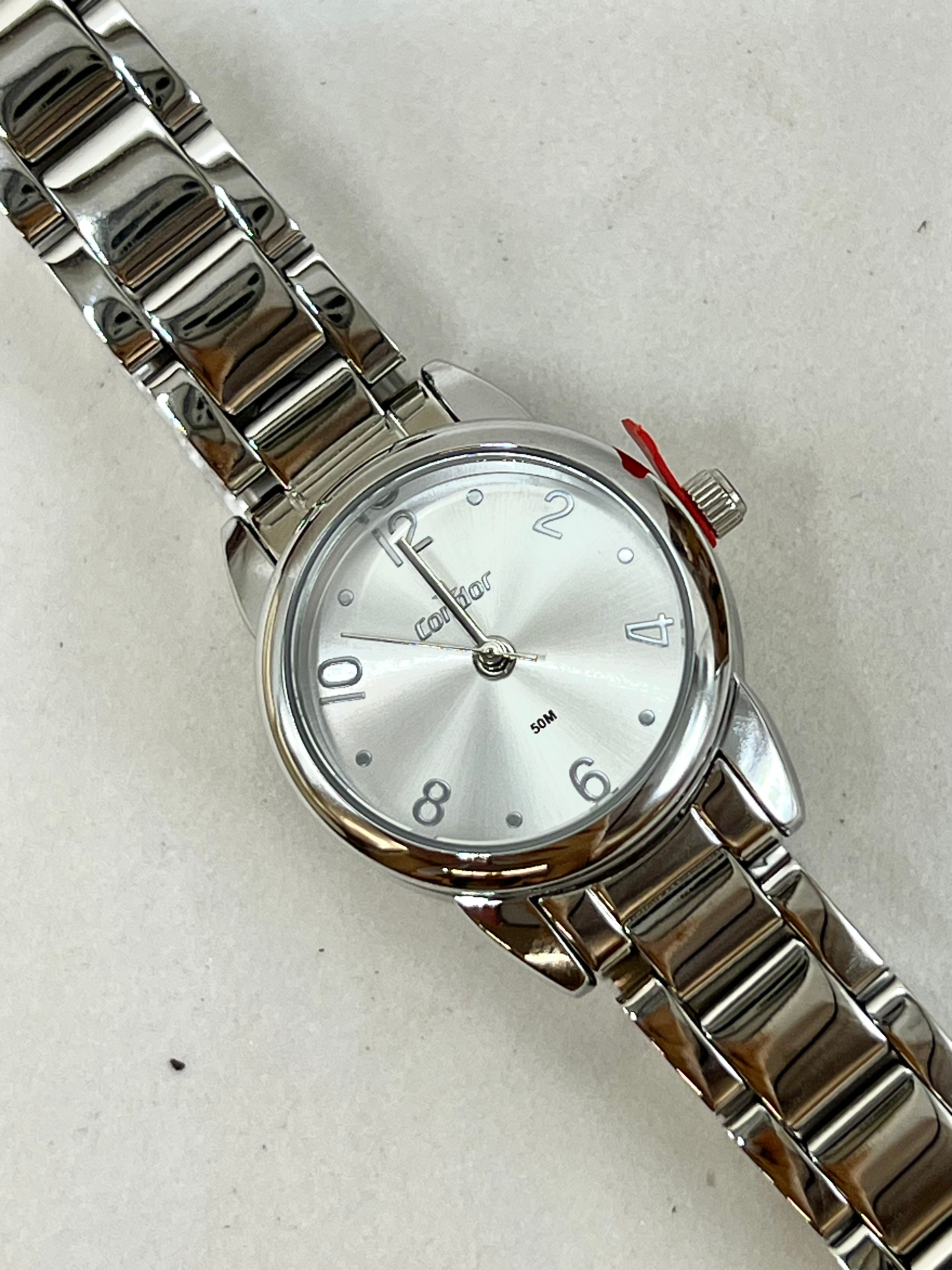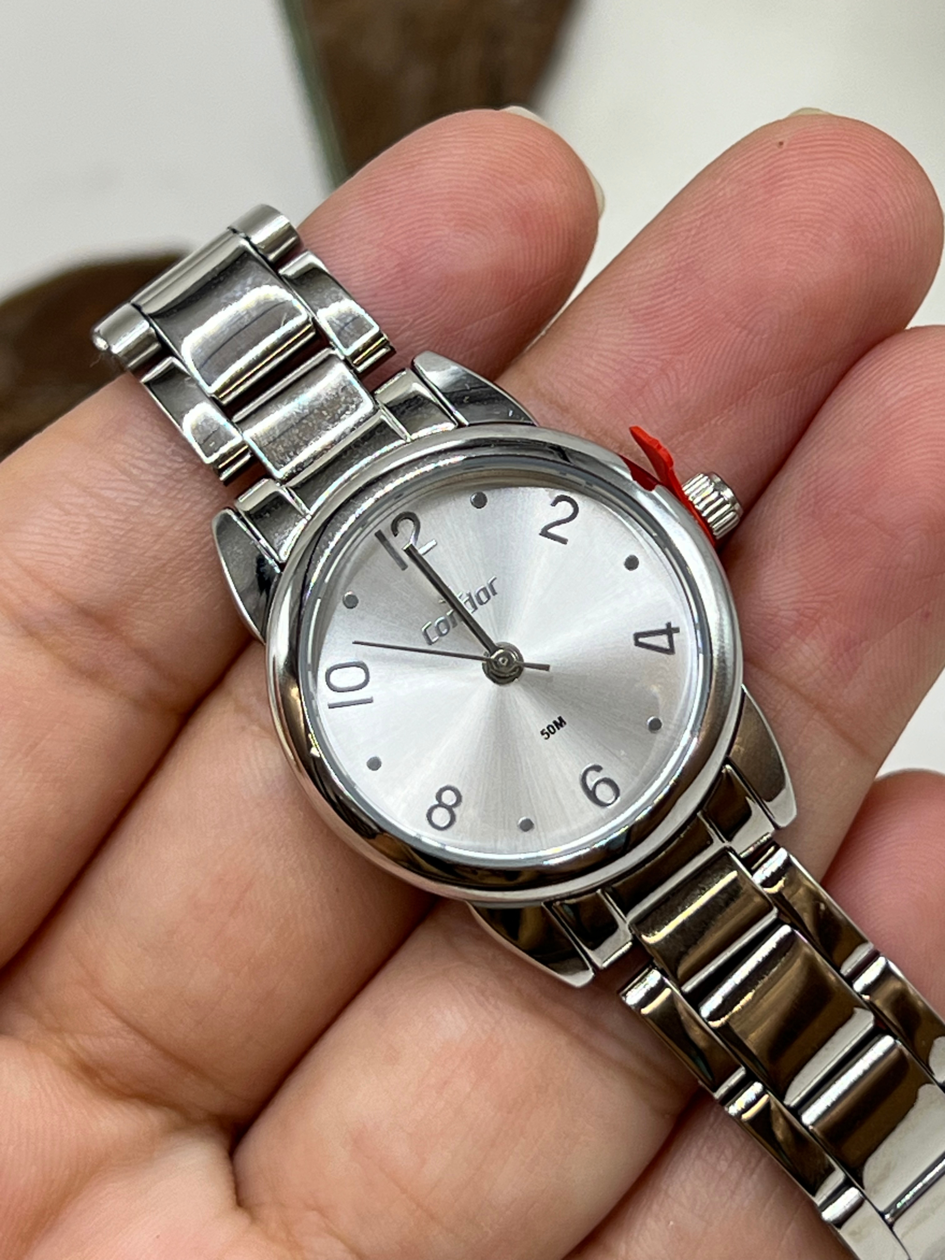Sua caixa redonda de 25 mm, produzida em metal com banho prata, apresenta tamanho reduzido e delicado, perfeito para pulsos menores ou para quem busca leveza e conforto. O mostrador prateado com números garante fácil leitura das horas, mantendo o visual limpo e atemporal. O visor em cristal mineral oferece proteção contra riscos leves do uso cotidiano.