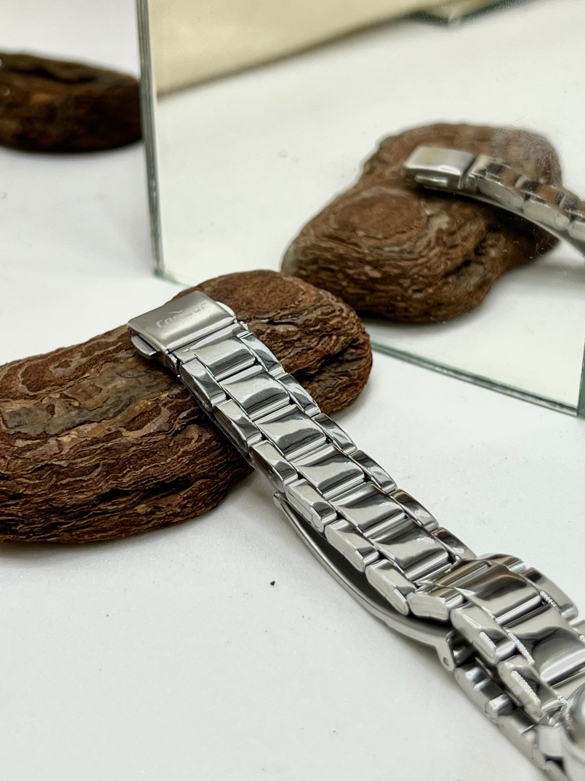 A pulseira em aço inoxidável prateado proporciona durabilidade, resistência e excelente adaptação ao pulso. O fecho seguro mantém praticidade no uso diário, reforçando a proposta funcional do modelo.