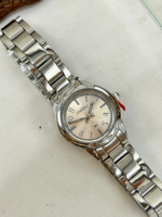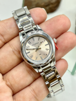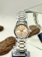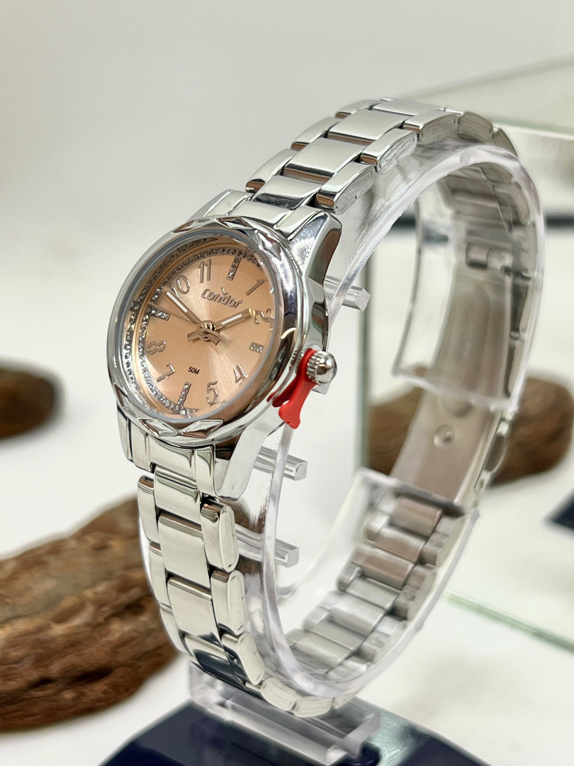 Sua caixa redonda de 25 mm, produzida em metal cromado com banho prata, apresenta proporções pequenas e femininas, perfeitas para quem prefere relógios mais sutis no pulso. O grande destaque está no mostrador rosê com aplicação de glitter, que adiciona charme e brilho na medida certa. Os marcadores de hora contam com aplicação de pedras (strass), reforçando a estética delicada do modelo. O visor em cristal mineral protege contra riscos leves do uso cotidiano.