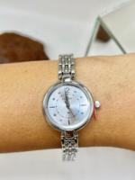 A pulseira em metal com 5 links, também no banho prata, possui apenas 8 mm de largura, oferecendo leveza e delicadeza ao conjunto. O fecho tipo joia garante segurança e acabamento sofisticado, mantendo o relógio firme e confortável no pulso.