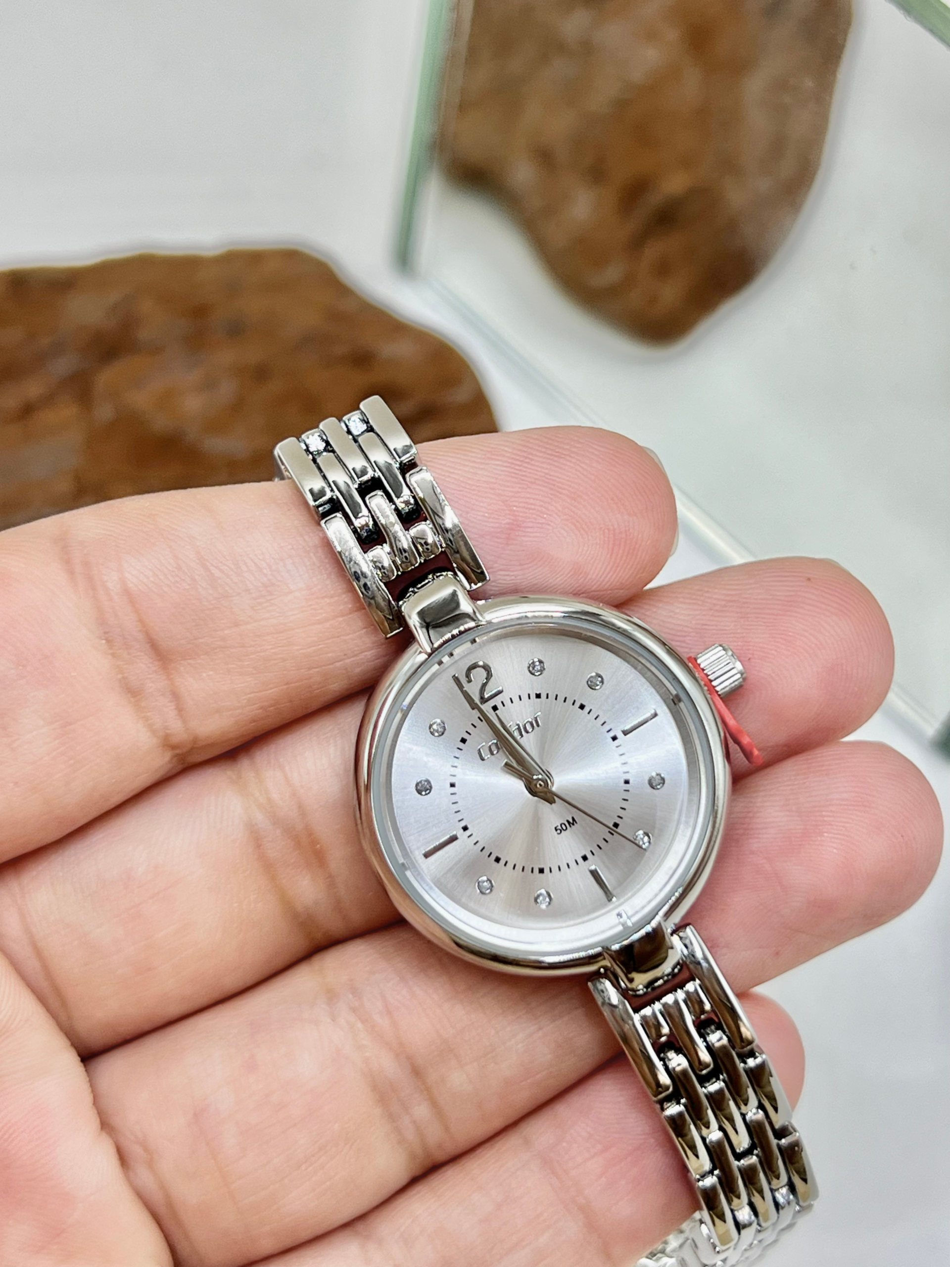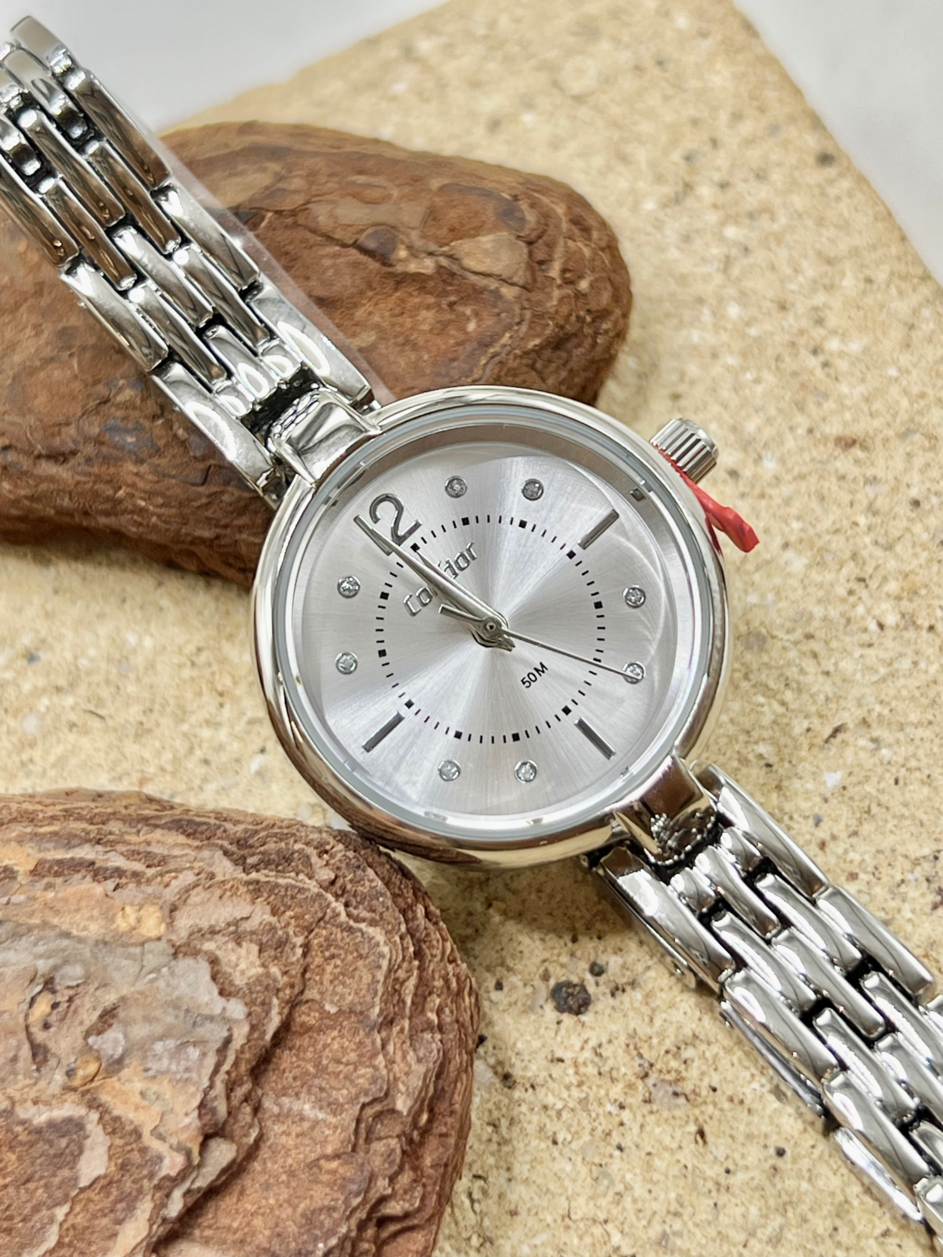 Sua caixa redonda de 25 mm, produzida em metal com banho prata, possui proporções compactas que se ajustam perfeitamente a pulsos delicados. O mostrador prateado com brilho adiciona charme ao modelo, podendo contar com aplicação de marcadores e detalhes em strass, reforçando o visual refinado e feminino. O vidro em cristal mineral protege o mostrador contra riscos do uso diário.