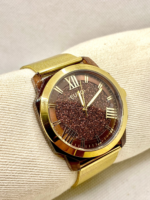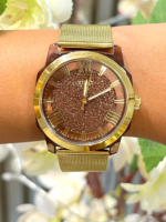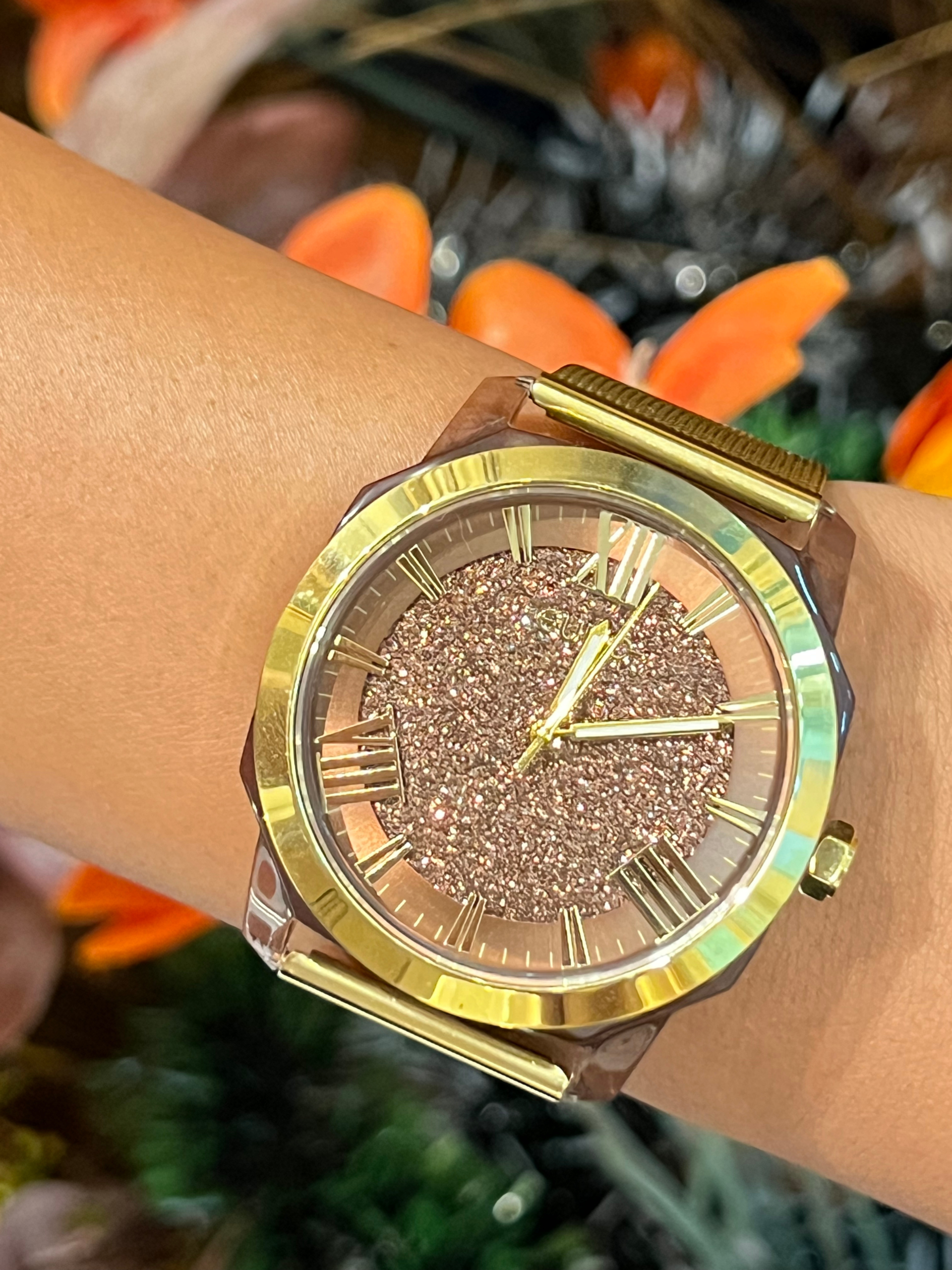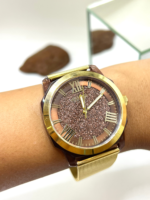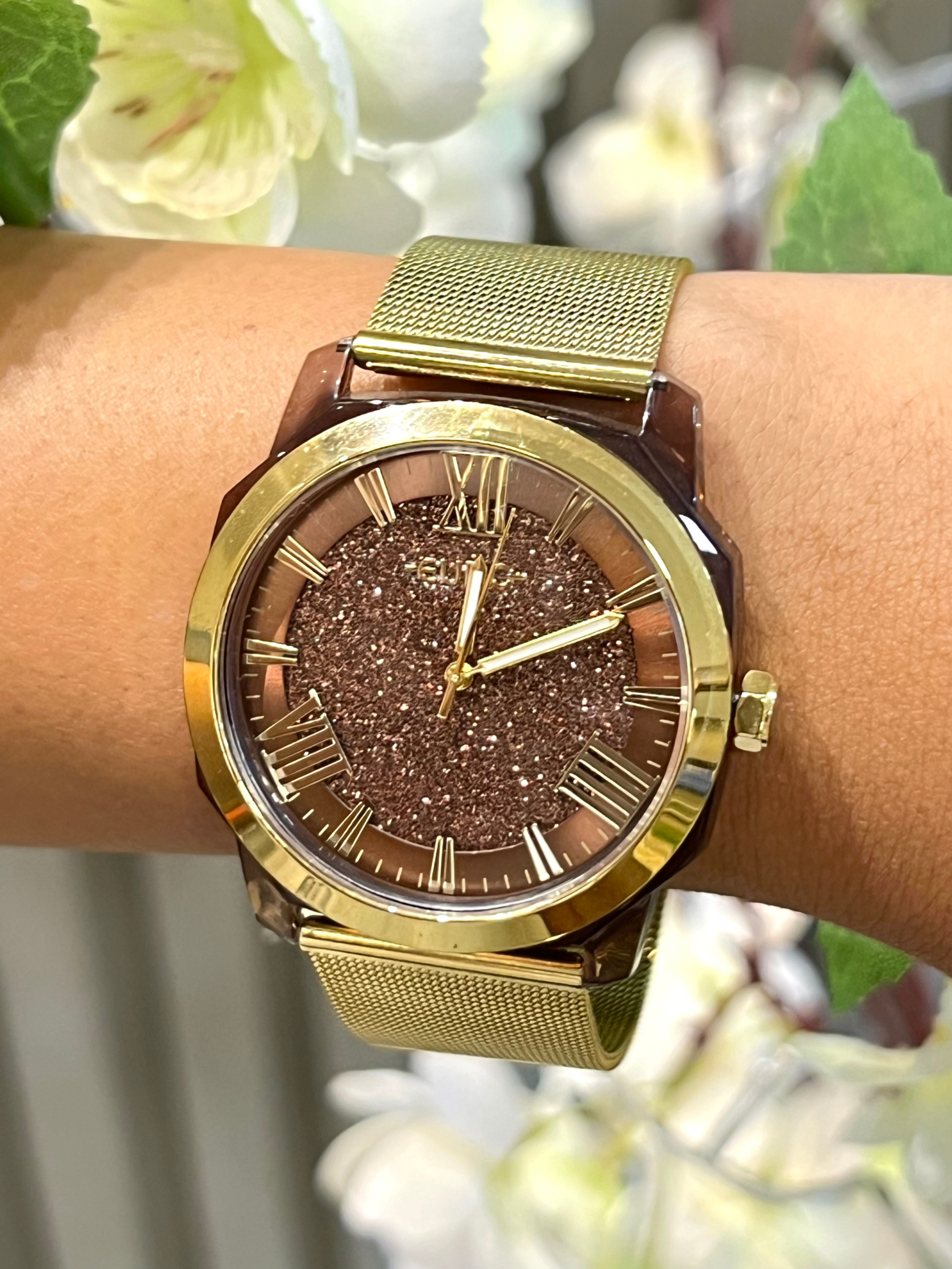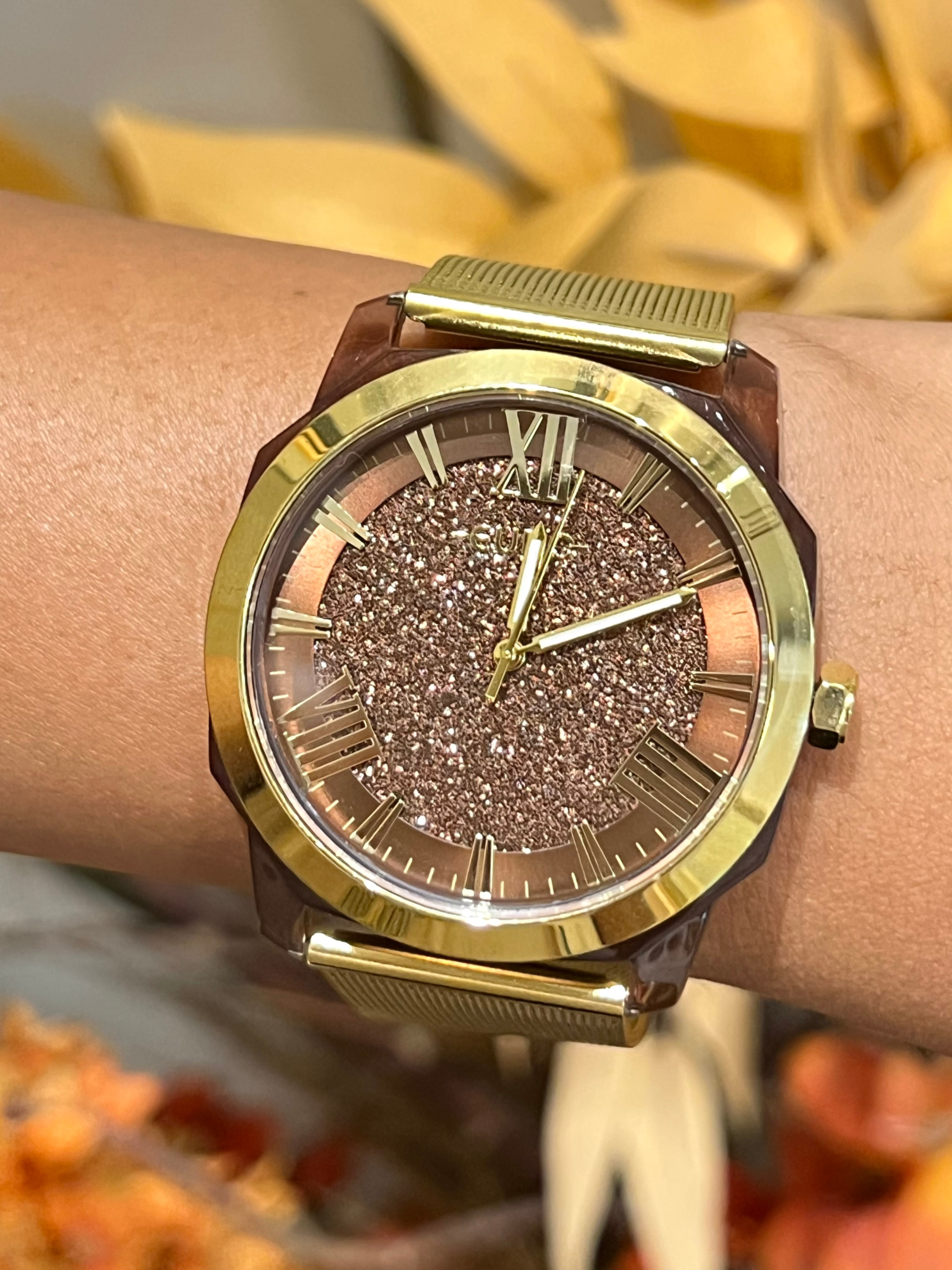 O modelo apresenta caixa com efeito translúcido em tom marrom, trazendo leveza e modernidade ao design. O mostrador com aplicação de glitter adiciona brilho sutil e sofisticado, criando um visual atual e alinhado às tendências da moda feminina.