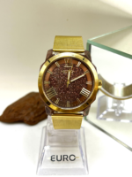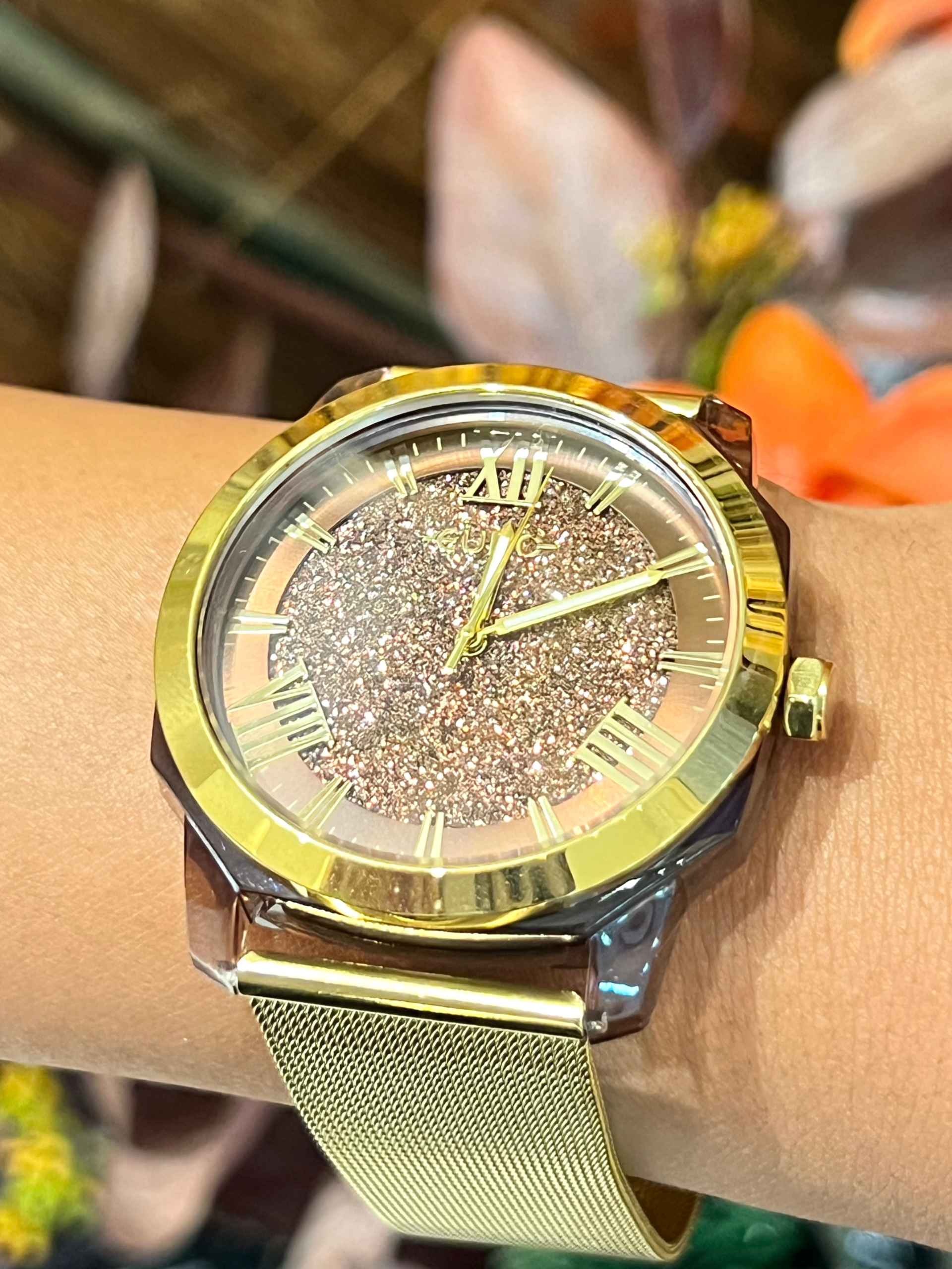 A pulseira em aço inoxidável dourado no estilo mesh (esteira) oferece excelente conforto, ajuste preciso e um acabamento elegante, aproximando o relógio do universo das joias. O conjunto equilibra brilho, delicadeza e presença visual.