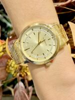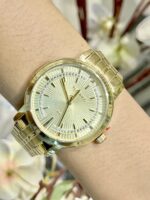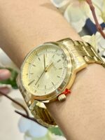 Produzido em aço inoxidável, o relógio possui caixa de 35 mm e pulseira em aço com 16 mm de largura, ambas com banho dourado, garantindo resistência, durabilidade e acabamento sofisticado. O fecho por botão lateral proporciona praticidade e conforto no uso diário.