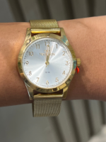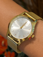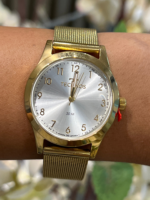 Um relógio delicado e sofisticado, com pulseira estilo esteira e design atemporal, ideal para compor looks elegantes no dia a dia ou em ocasiões especiais.