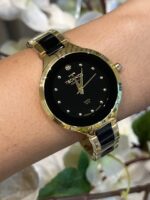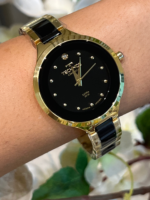 A caixa redonda de 36 mm, com acabamento dourado, é produzida em aço inoxidável, oferecendo robustez e excelente durabilidade. O mostrador preto cria um contraste elegante com os detalhes dourados, garantindo leitura clara e visual marcante. Seu design equilibrado torna o modelo versátil, adequado tanto para o uso diário quanto para ocasiões especiais.