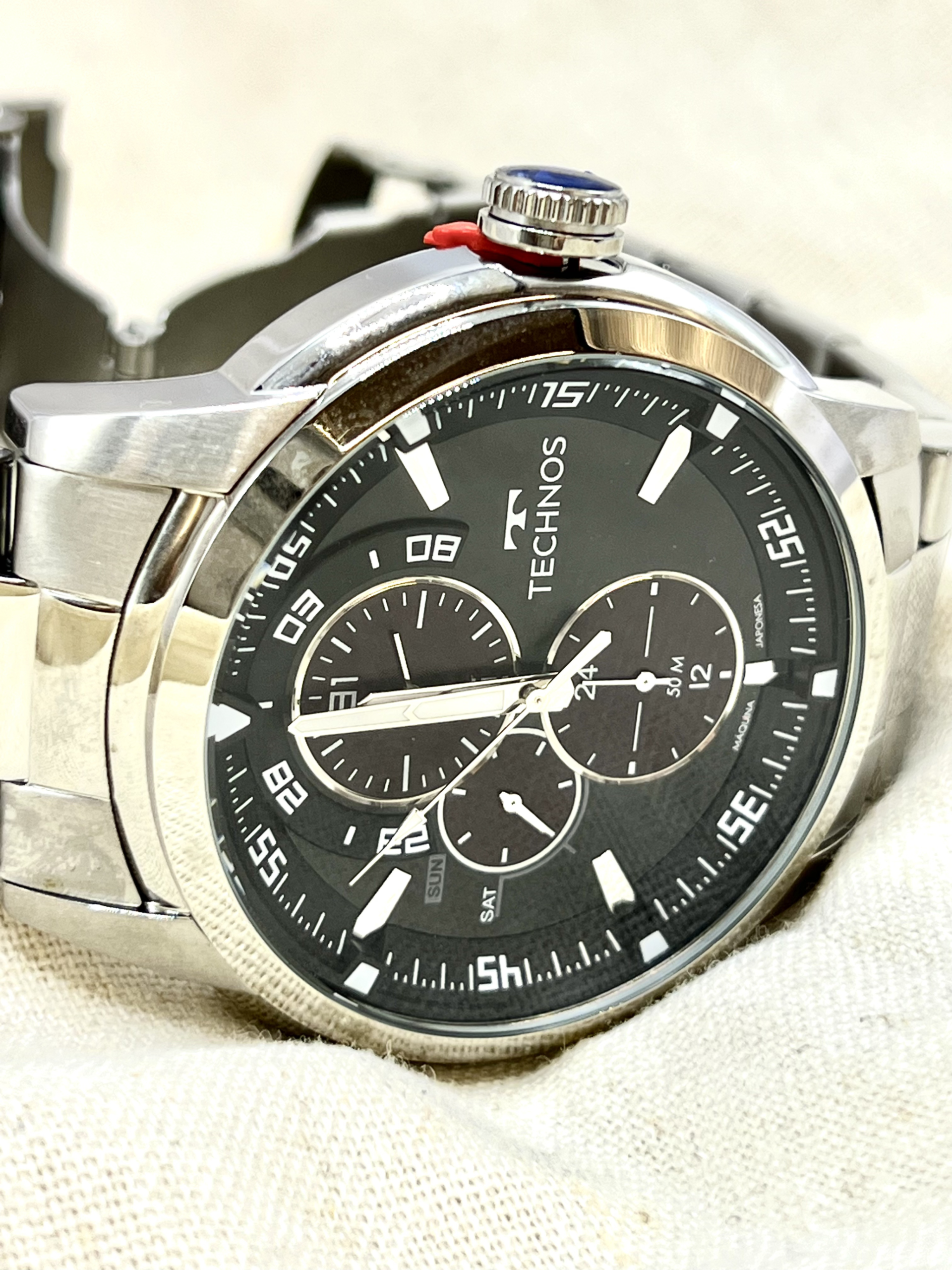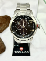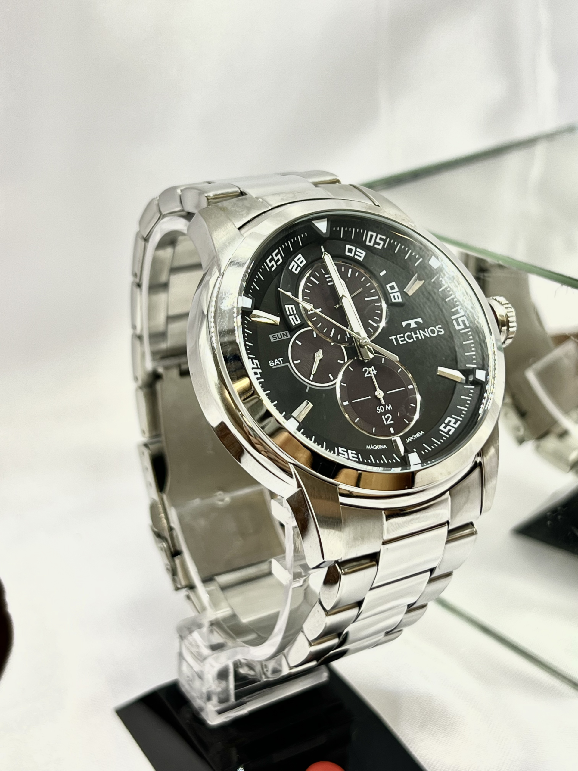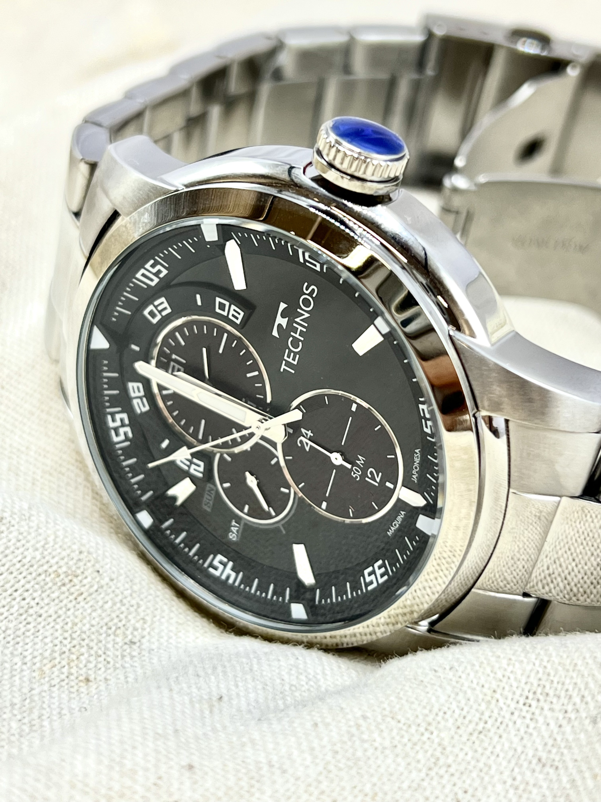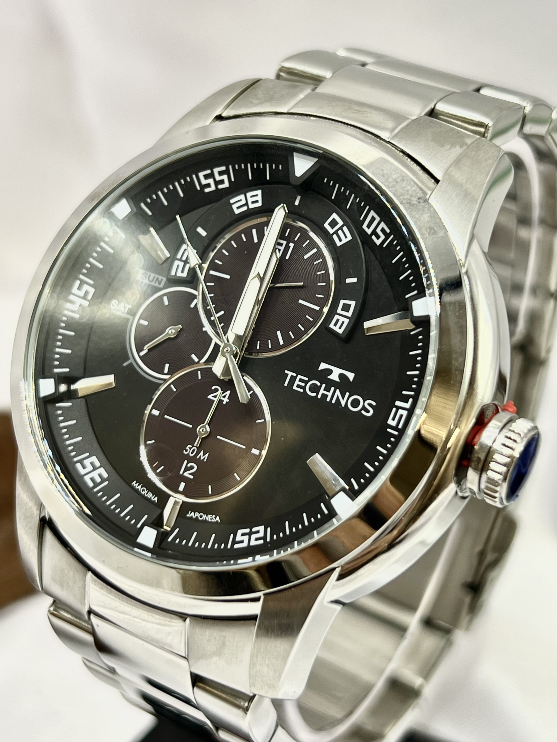 O relógio Technos Classic Grandtech prata é um modelo masculino multifuncional que une imponência, elegância e tradição relojoeira. Com design clássico e acabamento refinado, ele se destaca pelo mostrador preto sofisticado e pelo vidro mineral abaulado, detalhe inspirado na alta relojoaria que confere profundidade e charme ao visual.