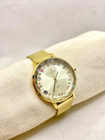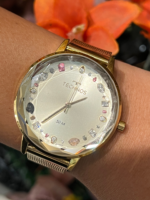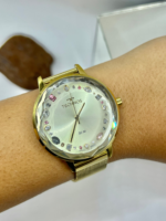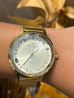 Produzido em aço inoxidável com banho dourado, o modelo apresenta uma caixa de 38 mm, que oferece presença equilibrada no pulso sem perder a delicadeza. O grande destaque fica por conta do mostrador em tom dourado/champagne, adornado com aplicação de cristais nos marcadores de hora, que proporcionam um brilho sofisticado e discreto.