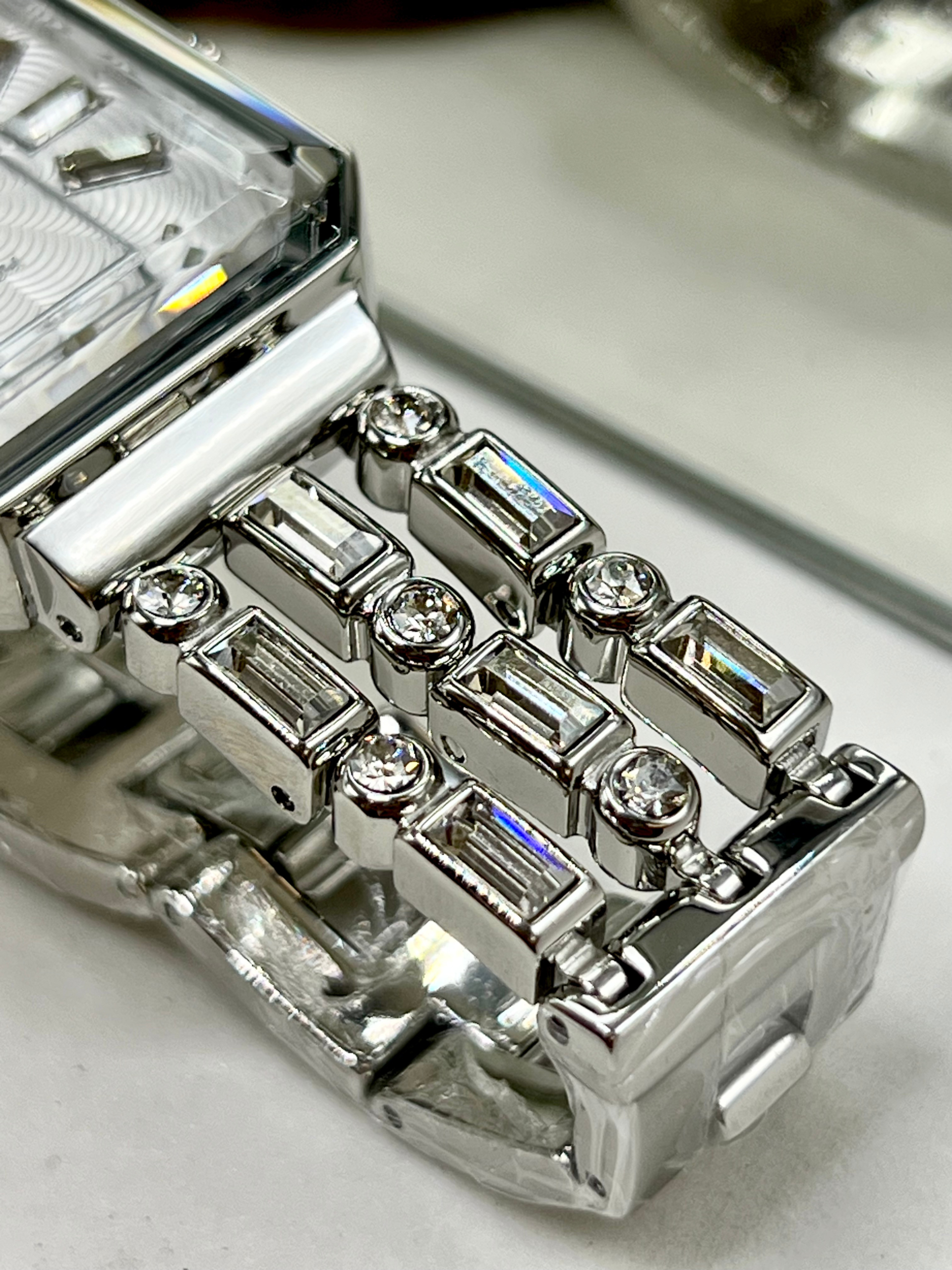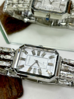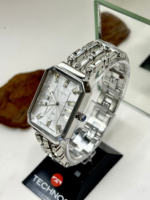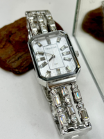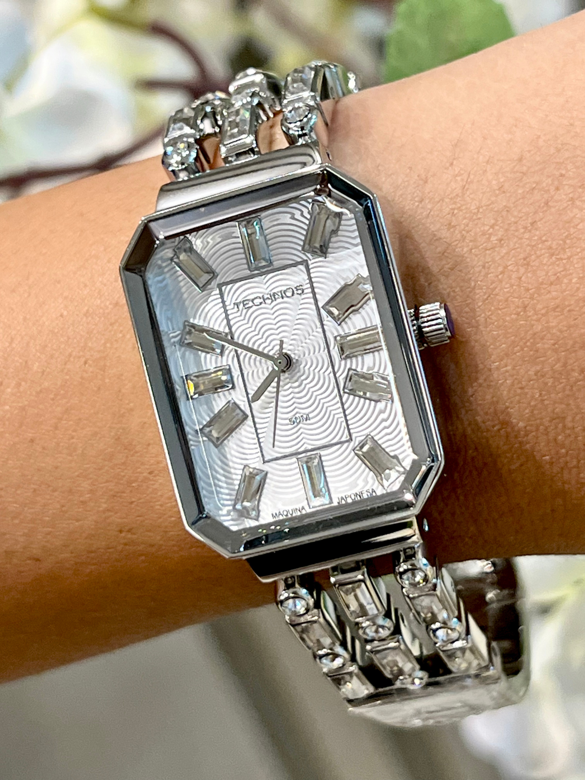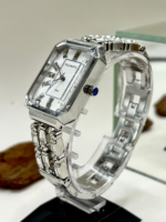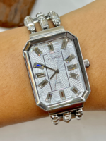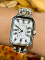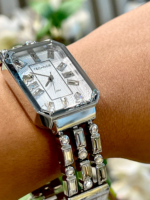 Sua caixa retangular, com dimensões aproximadas de 26 mm de largura por 39 mm de altura, apresenta proporções modernas e delicadas. O mostrador prateado é adornado com aplicação de cristais nos marcadores de hora, criando um efeito luminoso elegante e sofisticado, perfeito para compor produções formais ou elevar o look do dia a dia.