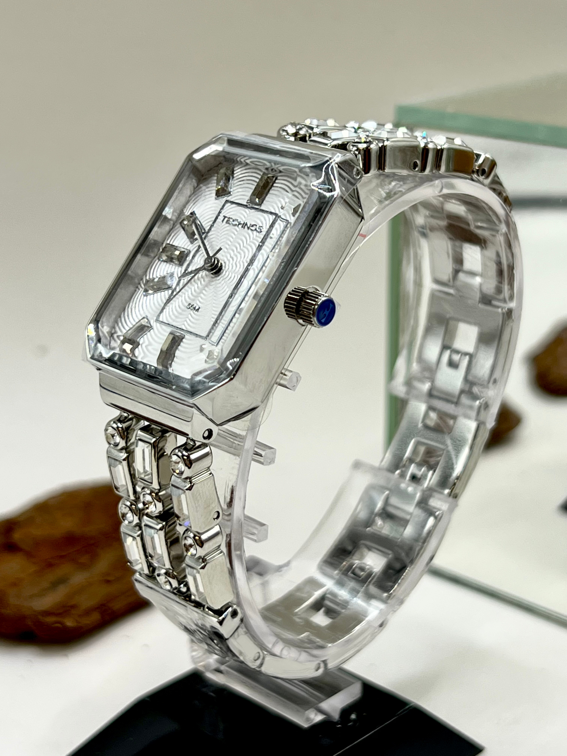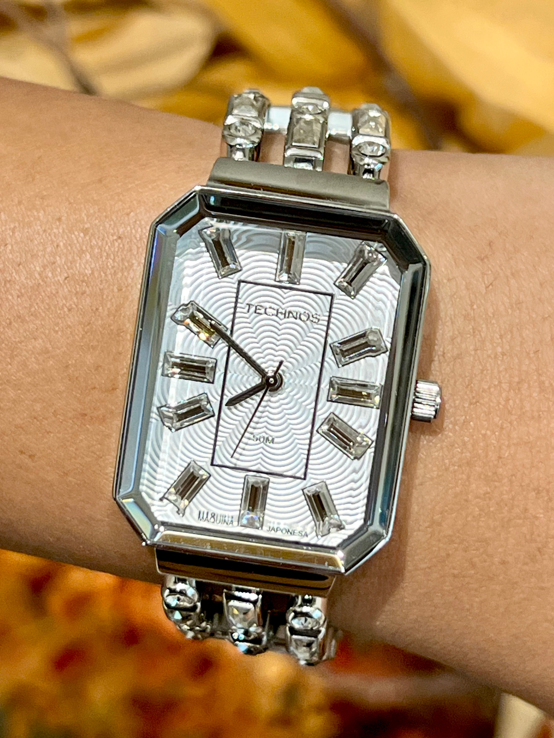 O relógio Technos Elegance Crystal prata é um modelo feminino sofisticado que combina a delicadeza de uma joia com a funcionalidade de um relógio analógico. Com design retangular e acabamento refinado em aço inoxidável prateado, ele é ideal para mulheres que valorizam elegância atemporal e brilho sutil no pulso.