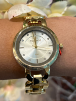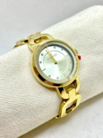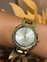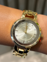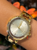 Produzido em aço inoxidável com banho dourado, o modelo apresenta uma pulseira de elos sólidos, com visual polido e estruturado, que remete diretamente à estética de joias clássicas. O mostrador dourado conta com aplicação de cristais nos marcadores de hora, proporcionando brilho sutil e elegante, ideal para compor looks sociais ou sofisticados do dia a dia.