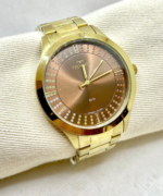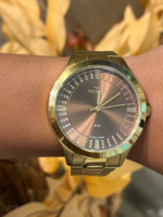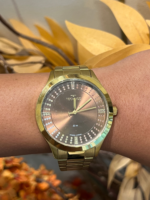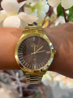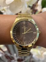 A pulseira dourada em aço inoxidável acompanha o acabamento da caixa, garantindo harmonia estética, conforto e durabilidade. Equipado com movimento Quartz japonês Miyota, o modelo oferece precisão e confiabilidade no uso diário.