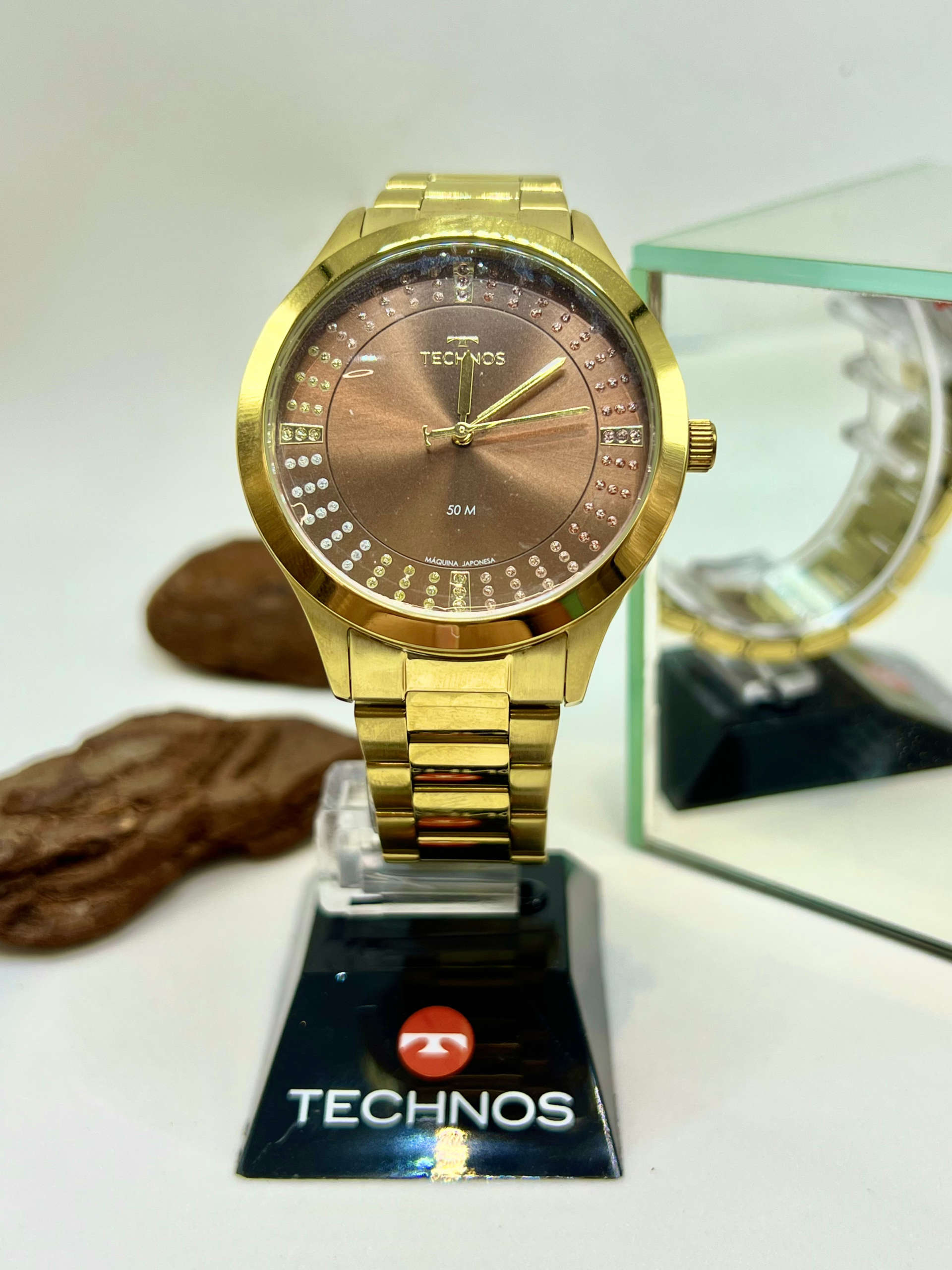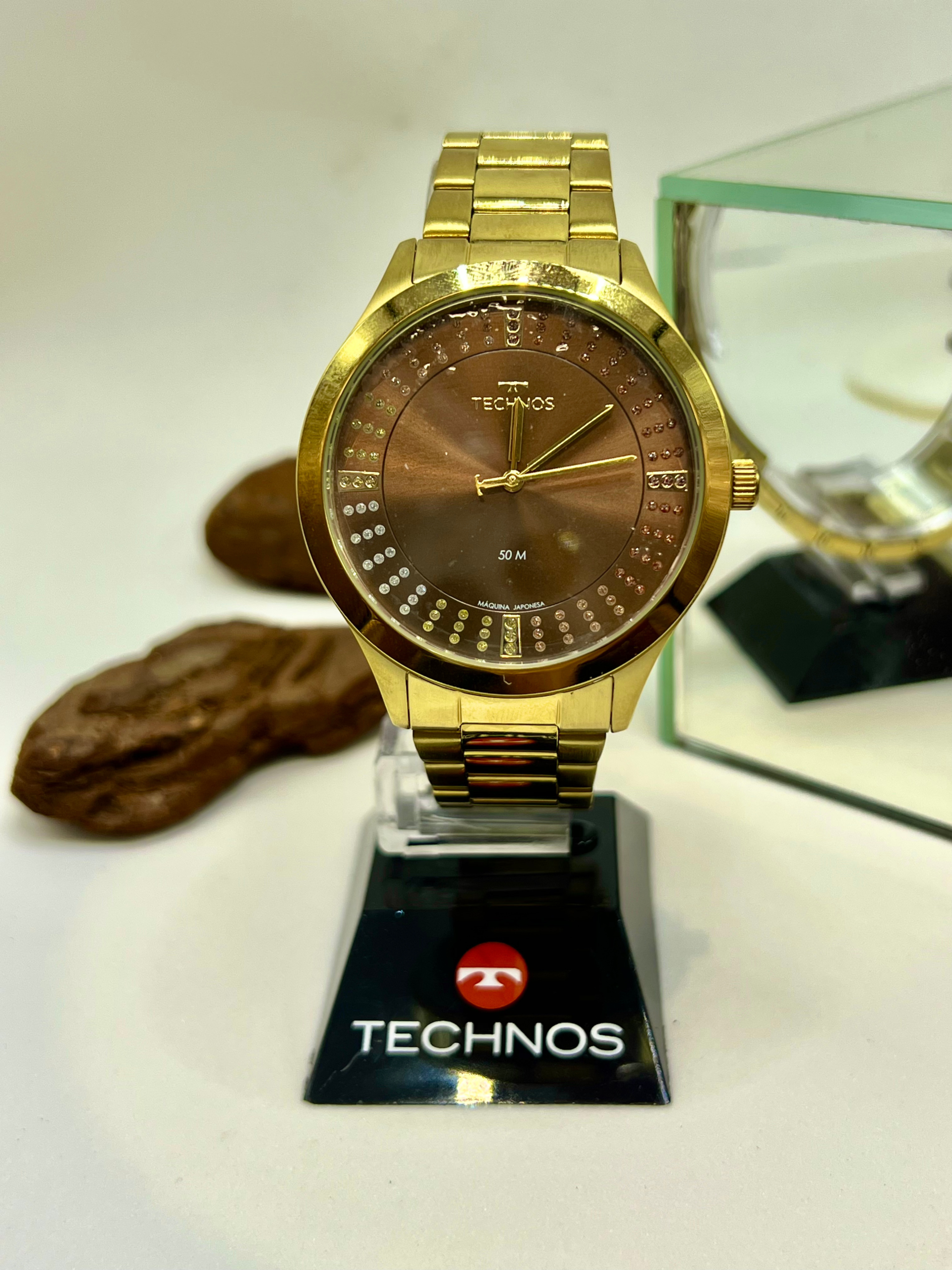 Relógio feminino Technos dourado com mostrador marrom e efeito brilho