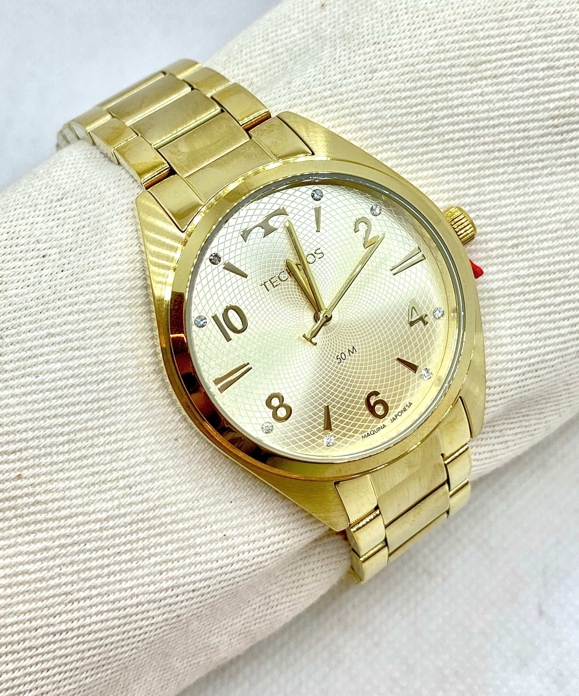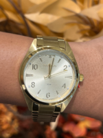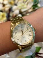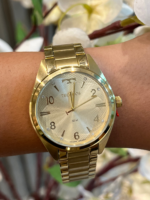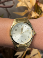 Produzido em aço inoxidável, o modelo apresenta caixa e pulseira douradas, com pulseira de 3 elos e acabamento escovado no elo central, garantindo um visual refinado e confortável para uso prolongado. Seu mostrador trabalhado se destaca pela numeração arábica, aplicação de cristais nos marcadores de hora e excelente legibilidade.