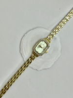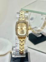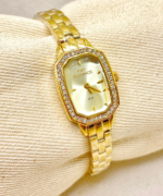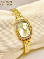 Produzido em aço inoxidável com banho dourado, o modelo apresenta caixa pequena e delicada, ideal para pulsos finos. O aro externo conta com aplicação de pedras cravejadas, criando um brilho marcante que transforma o relógio em uma verdadeira joia no pulso.