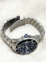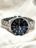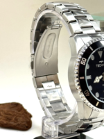 Com caixa de 44,5 mm em aço inoxidável, o modelo apresenta construção sólida e visual esportivo. O aro externo giratório unidirecional, com acabamento corrugado, é um elemento essencial para medições em atividades submersas. O mostrador conta com acabamento degradê, detalhes geométricos e ponteiros e marcadores luminescentes, garantindo excelente visibilidade mesmo em ambientes com pouca luz.