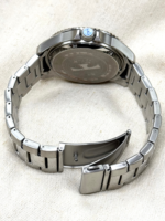 A pulseira em aço inoxidável prata, com fecho por botão lateral, proporciona segurança e conforto. O modelo é 100% em aço inoxidável e conta com resistência à água de 15 ATM (150 metros), sendo adequado para natação e atividades aquáticas, além de possuir vedação reforçada com tampa traseira rosqueada.