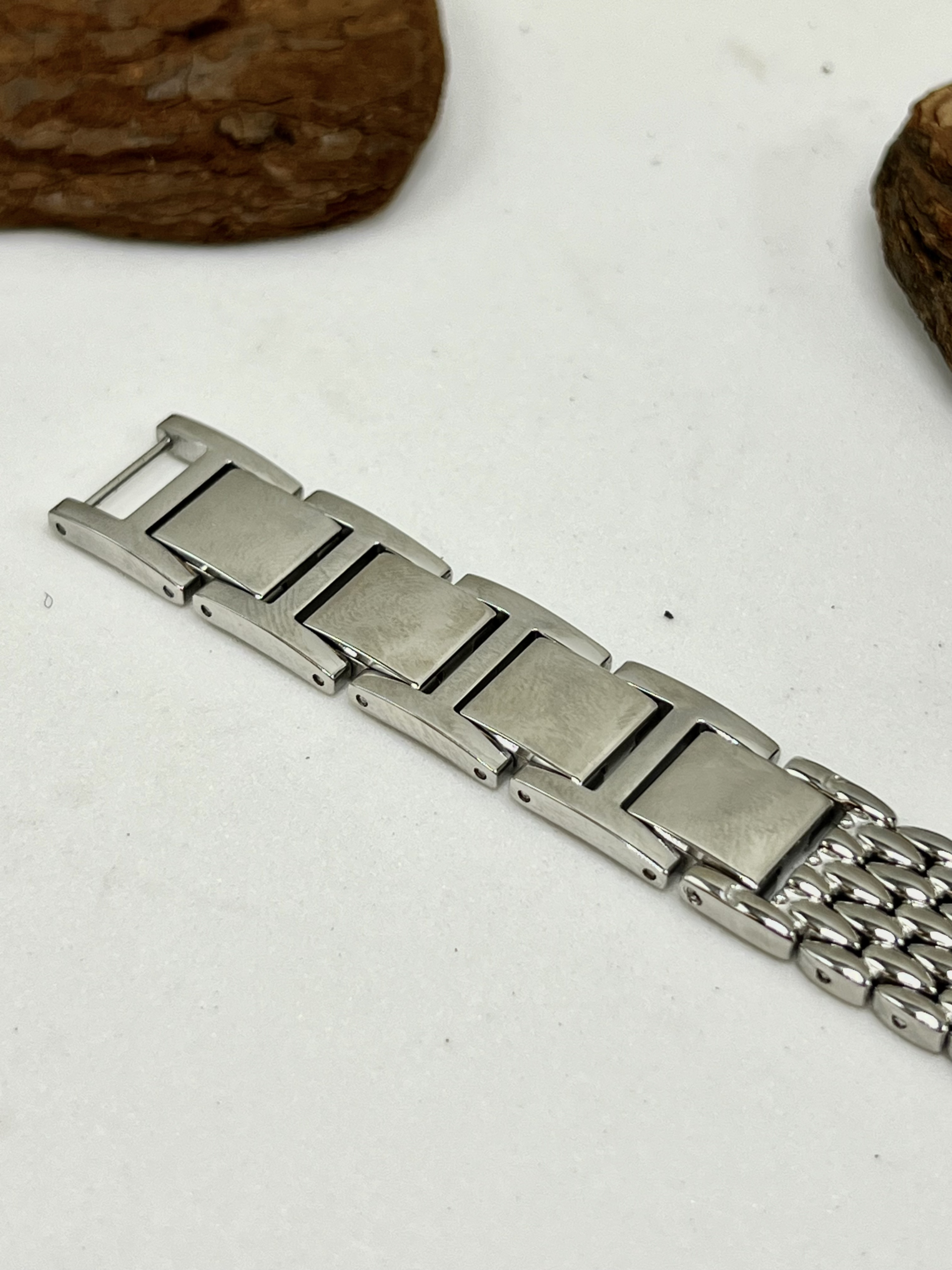 A pulseira sólida em aço inoxidável, com fecho tipo joia, proporciona acabamento elegante e encaixe seguro no pulso. Com resistência à água de 5 ATM (50 metros), o modelo suporta respingos e chuva leve, sendo indicado para o dia a dia, mas não recomendado para natação ou banho.