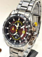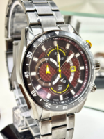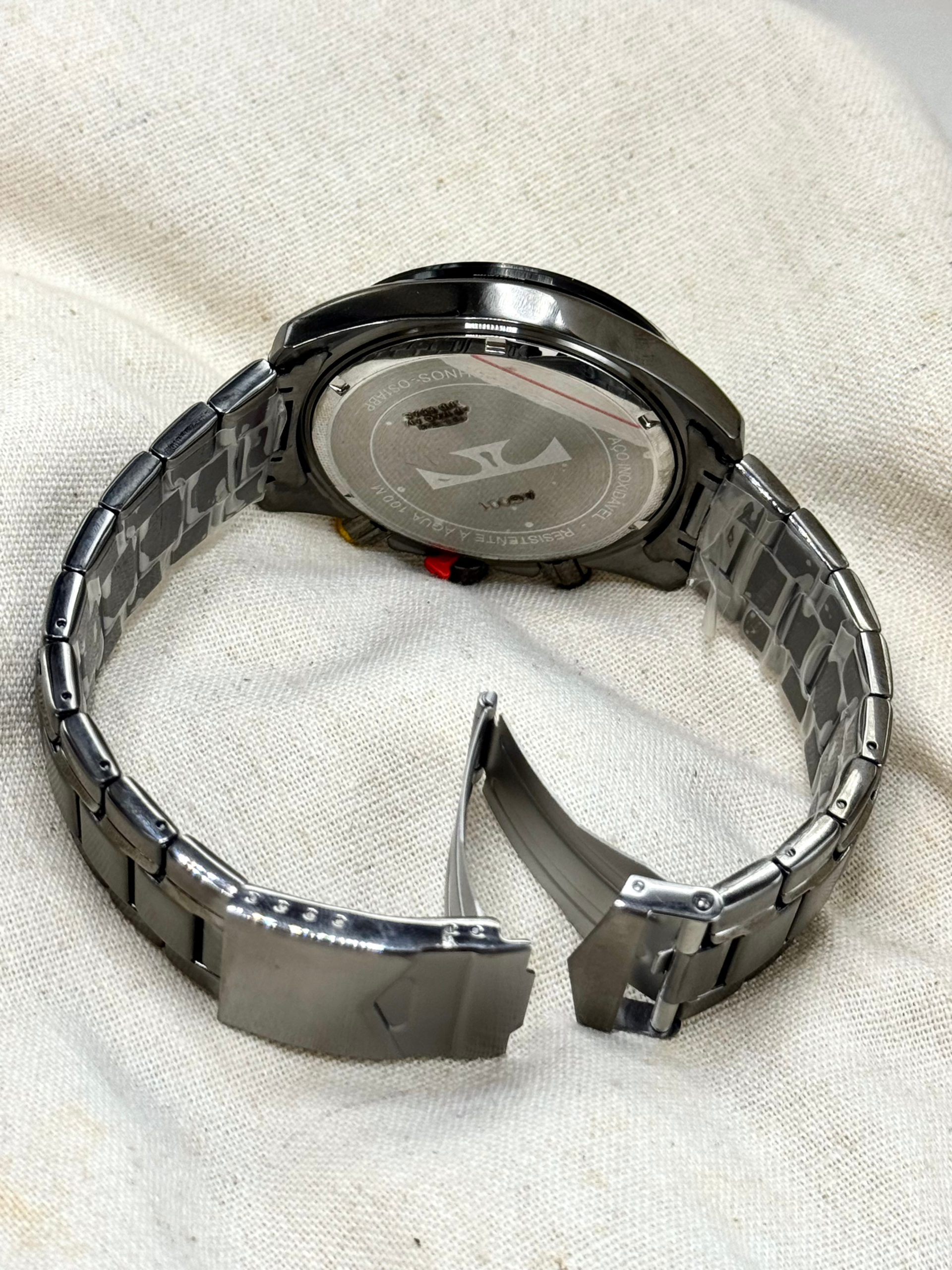 A pulseira em aço inoxidável grafite proporciona durabilidade e segurança, complementando o visual esportivo do conjunto. Com resistência à água de 10 ATM (100 metros), o relógio é adequado para natação e uso cotidiano, não sendo indicado para mergulho profundo.