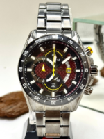 Equipado com mecanismo analógico a quartzo tipo cronógrafo, o modelo oferece múltiplas funções, incluindo cronógrafo completo, calendário com dia do mês, indicador 12/24 horas e taquímetro no bisel, ideal para medições de velocidade. O vidro em cristal mineral protege o mostrador, garantindo resistência ao uso diário.