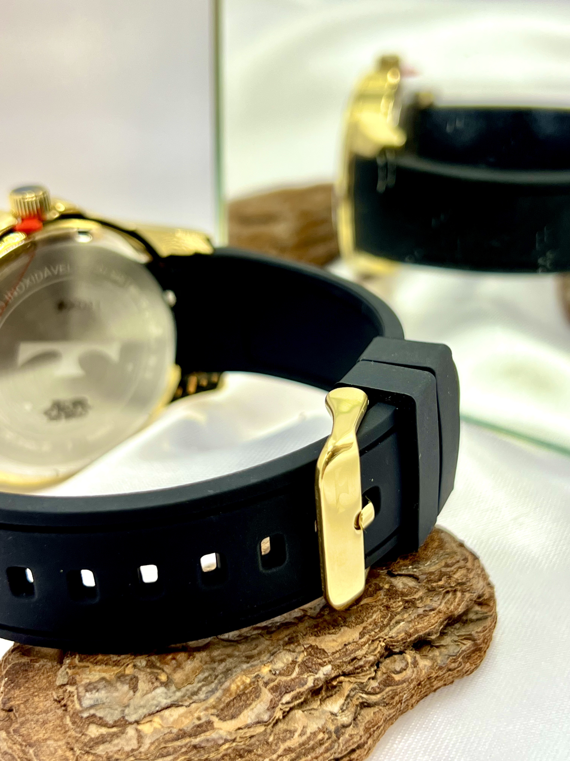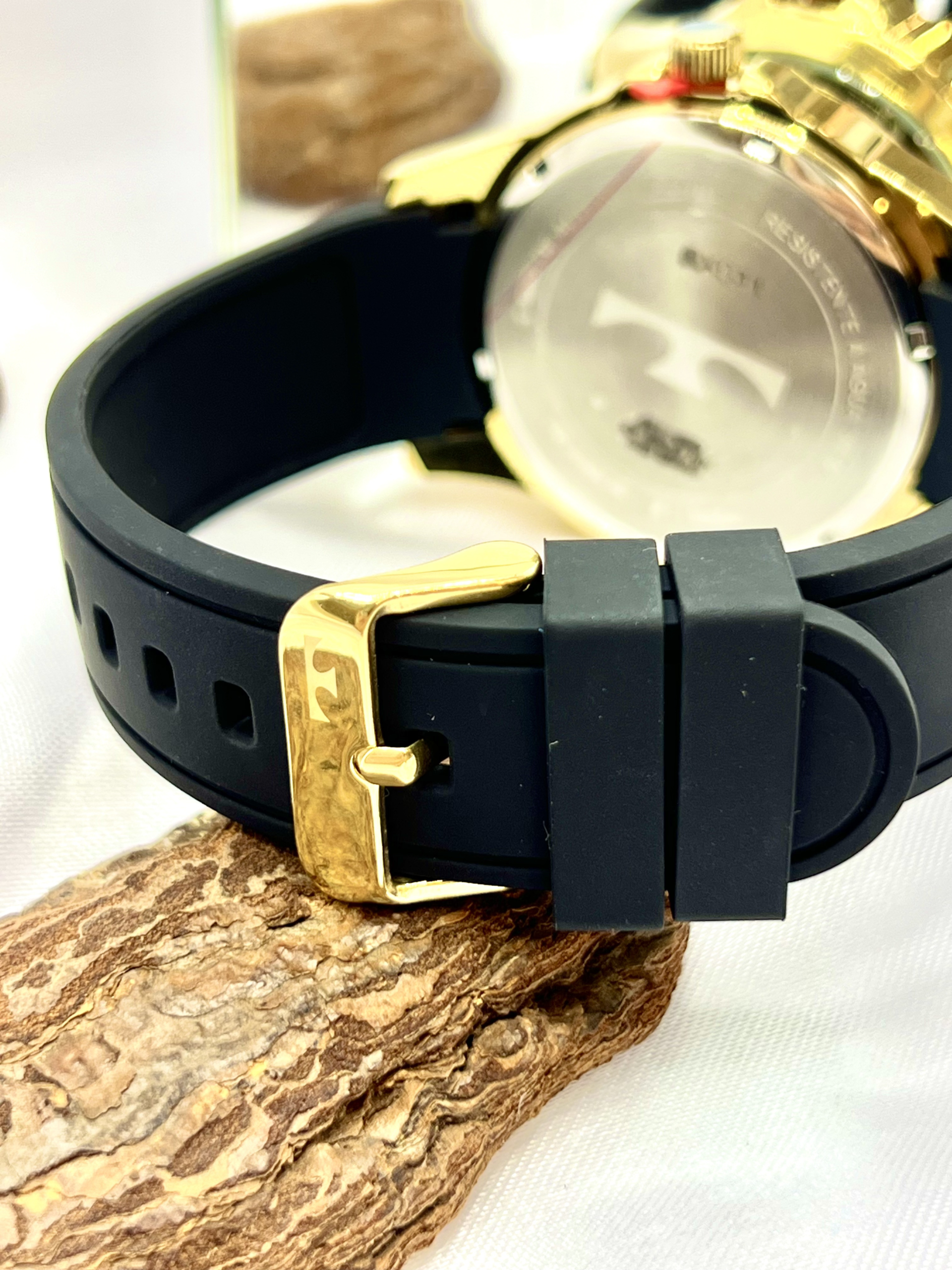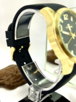 Com caixa em aço inoxidável e design imponente de 45 mm, o modelo entrega visual forte e contemporâneo. Apesar do nome comercial “Prata”, esta referência apresenta acabamento em tom dourado, criando contraste sofisticado com o mostrador escuro e a pulseira preta.
