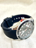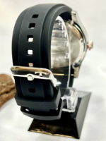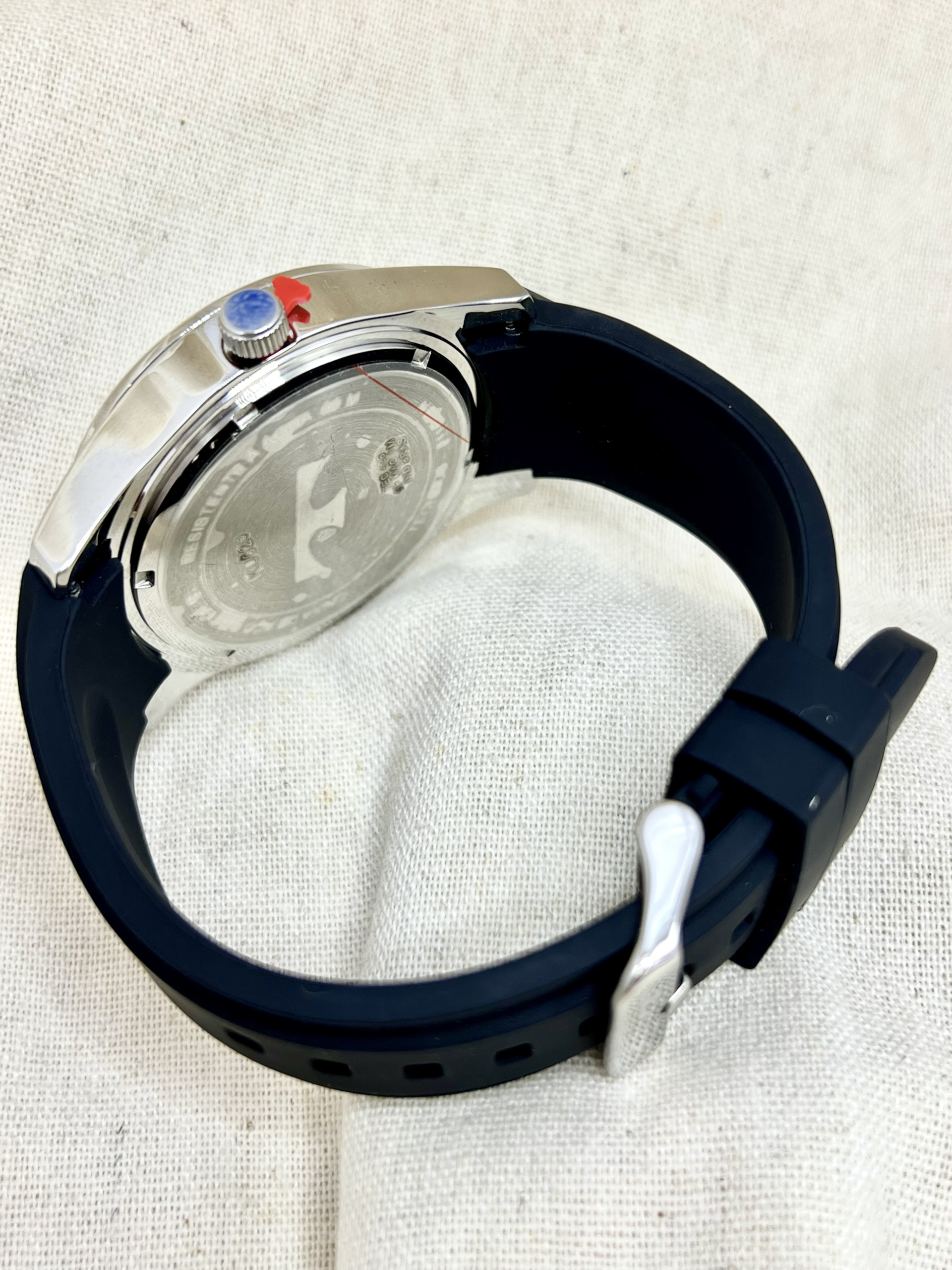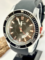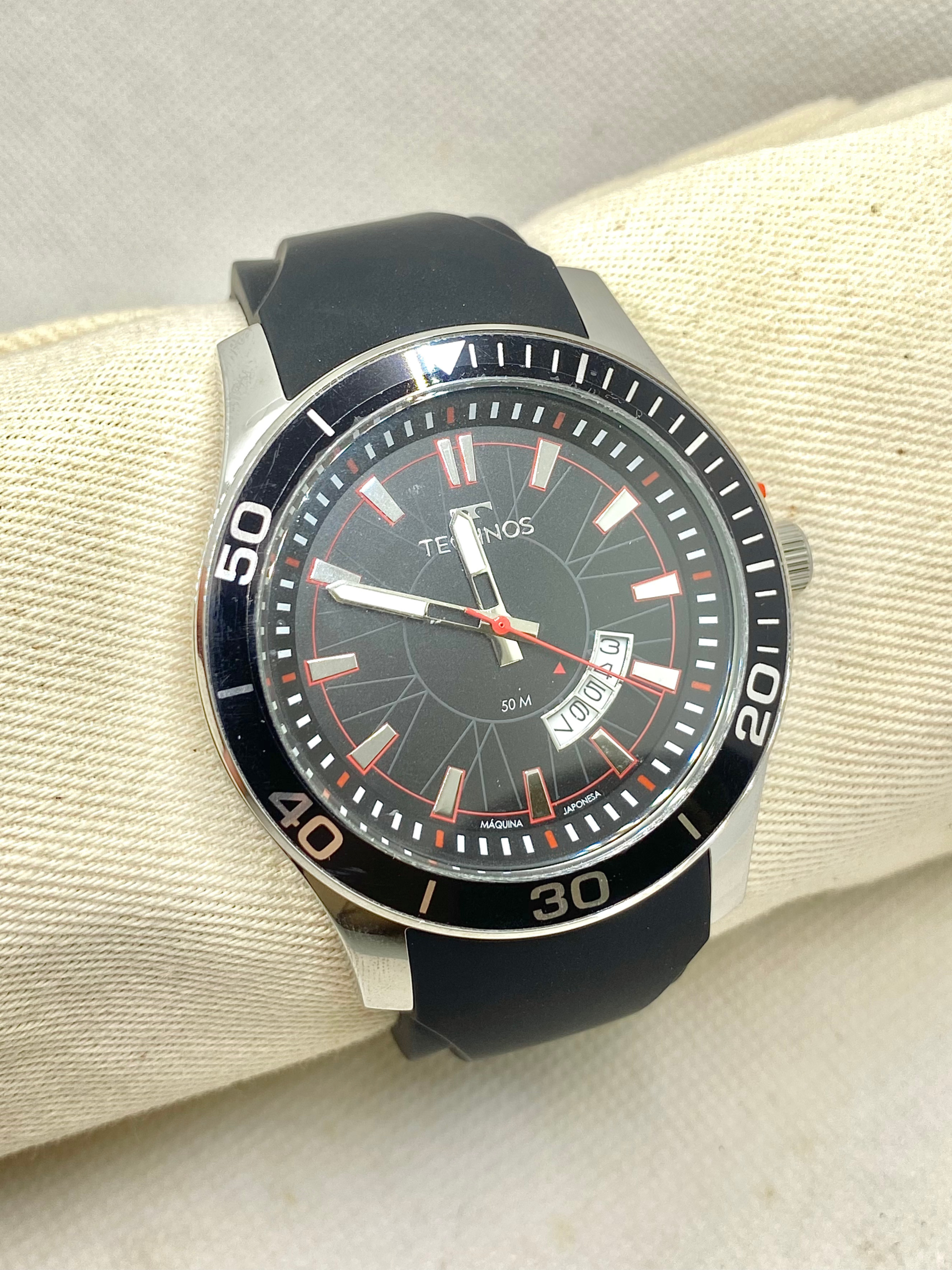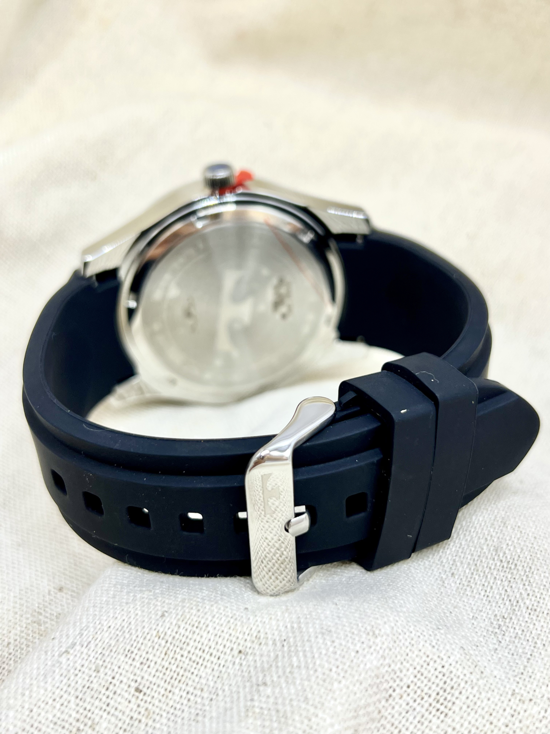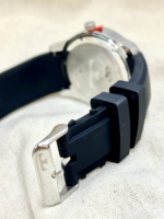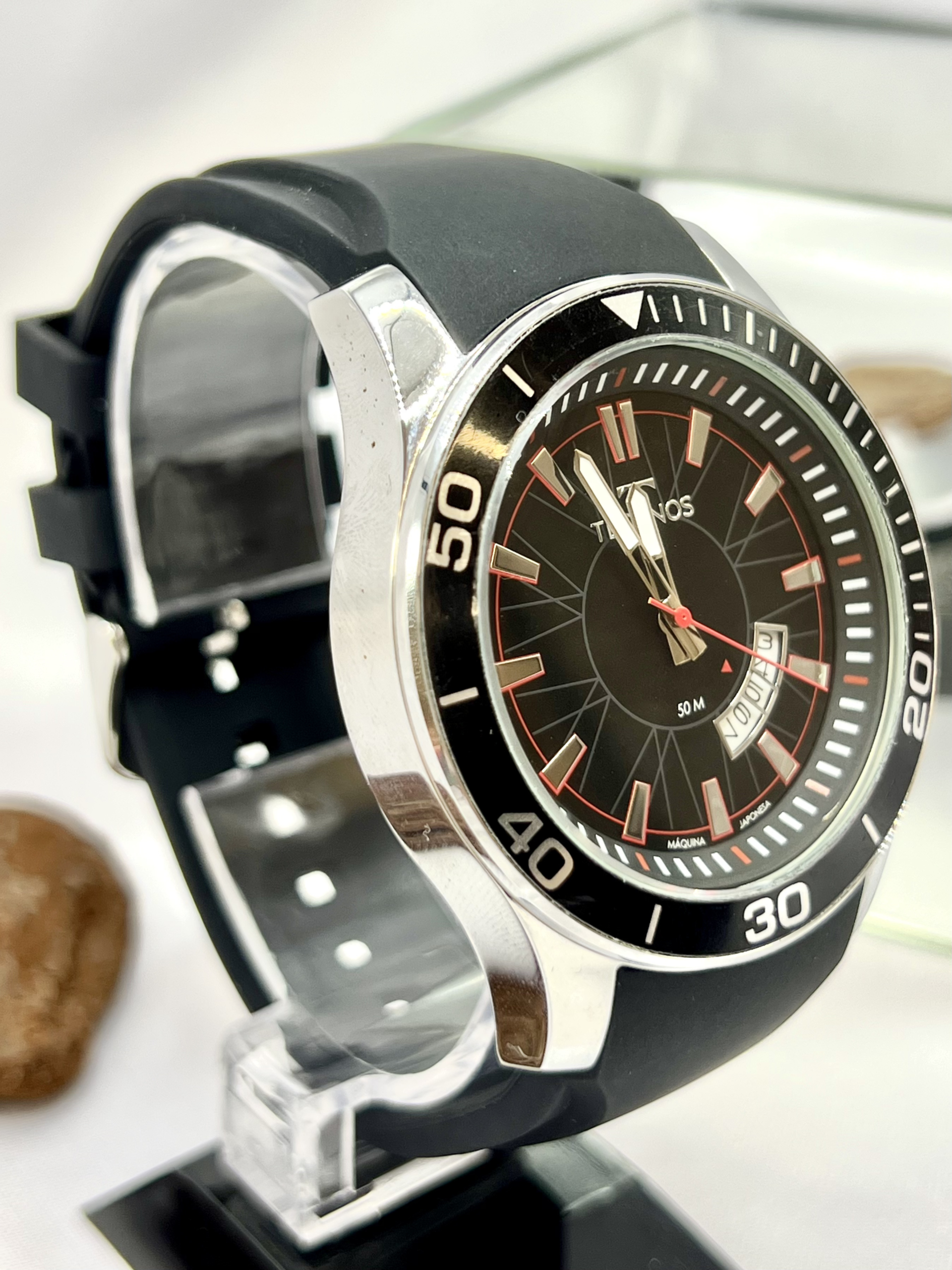 Com caixa em aço inoxidável na cor prata e imponentes 46 mm de diâmetro, o modelo apresenta presença forte no pulso. Seu mostrador preto ganha destaque com detalhes em vermelho, remetendo aos painéis esportivos e reforçando sua identidade dinâmica e moderna.