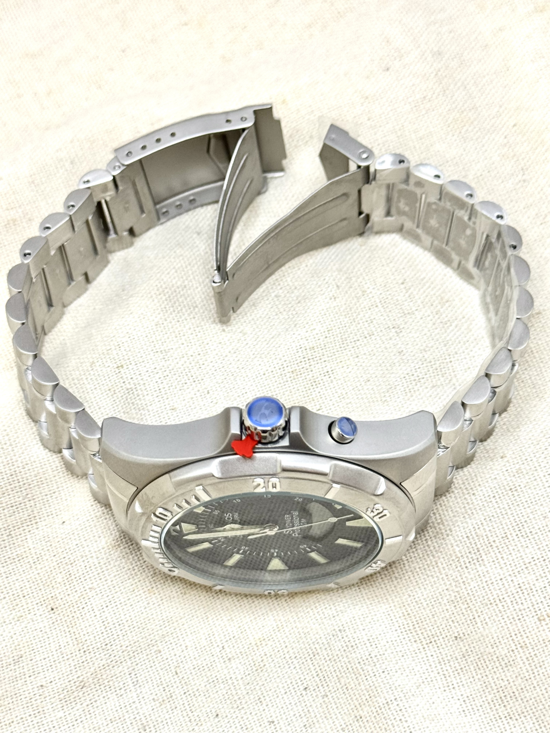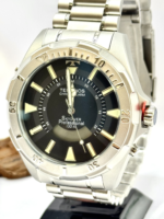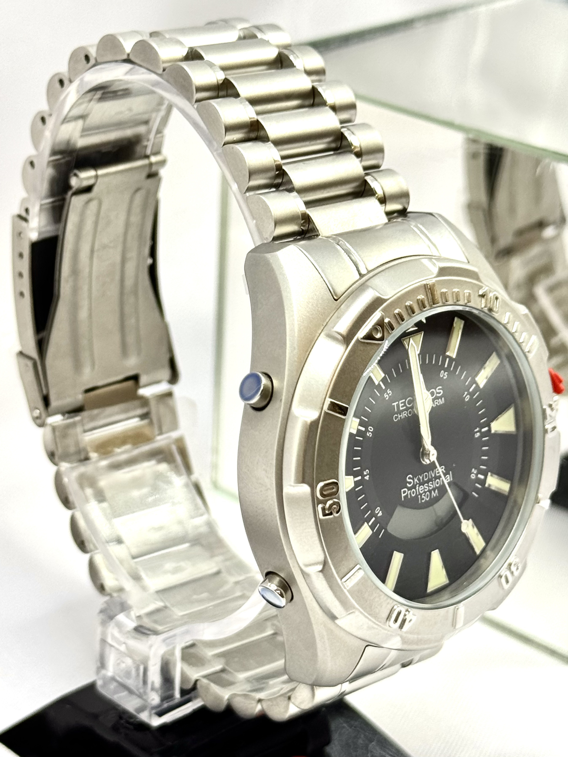 Com caixa de 48 mm em aço inoxidável, o modelo transmite imponência e resistência. Seu diferencial está no tradicional display digital em formato de “sorriso”, característica clássica da linha Skydiver. O mostrador preto contrasta com a caixa e pulseira prata, garantindo excelente legibilidade.