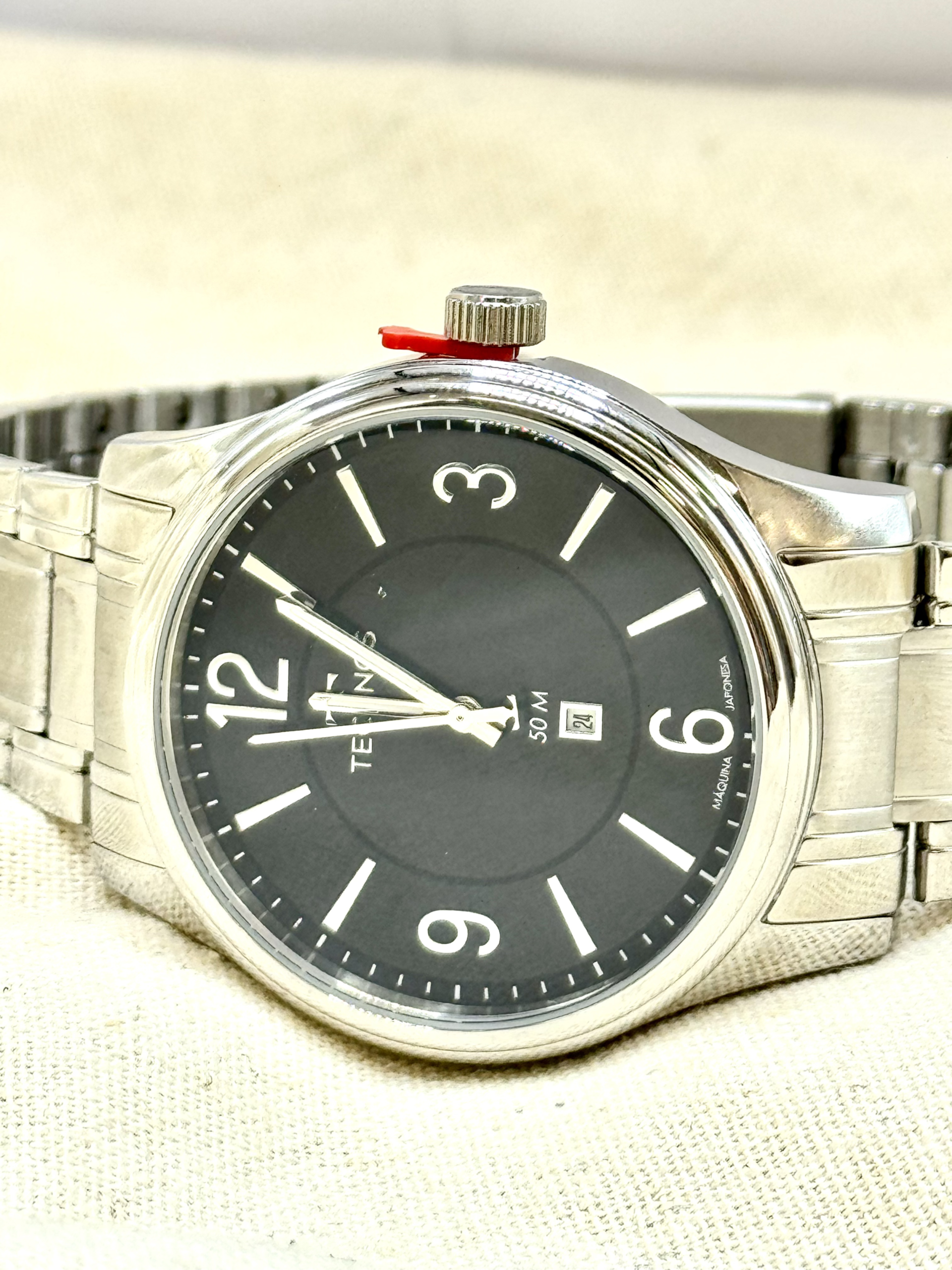 Equipado com mecanismo quartzo japonês Miyota, o modelo garante precisão e confiabilidade. Conta ainda com calendário (data do mês) posicionado de forma funcional no mostrador, agregando praticidade à rotina.