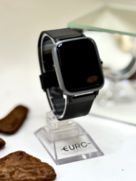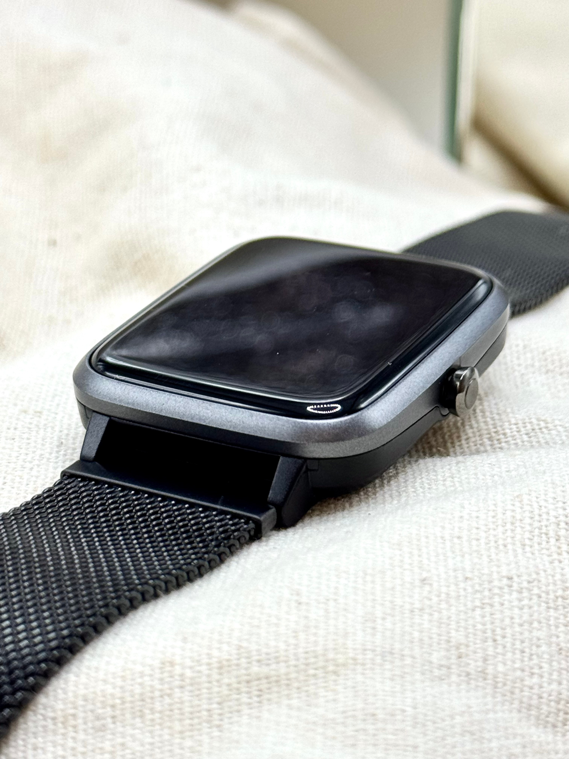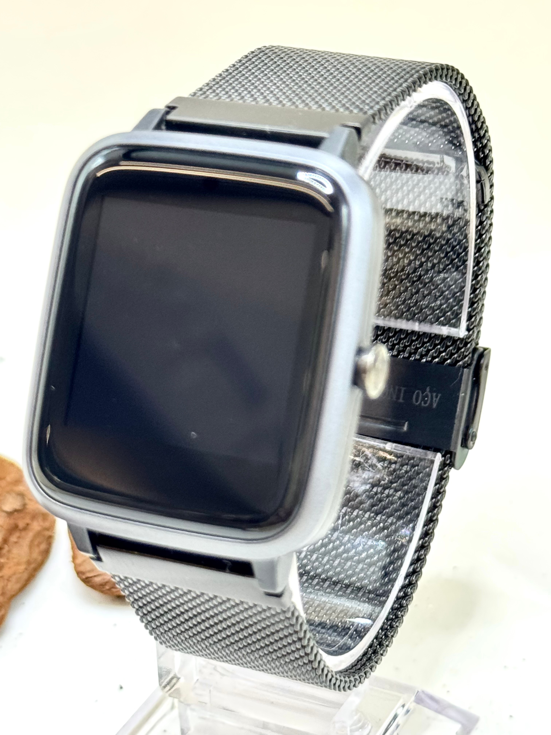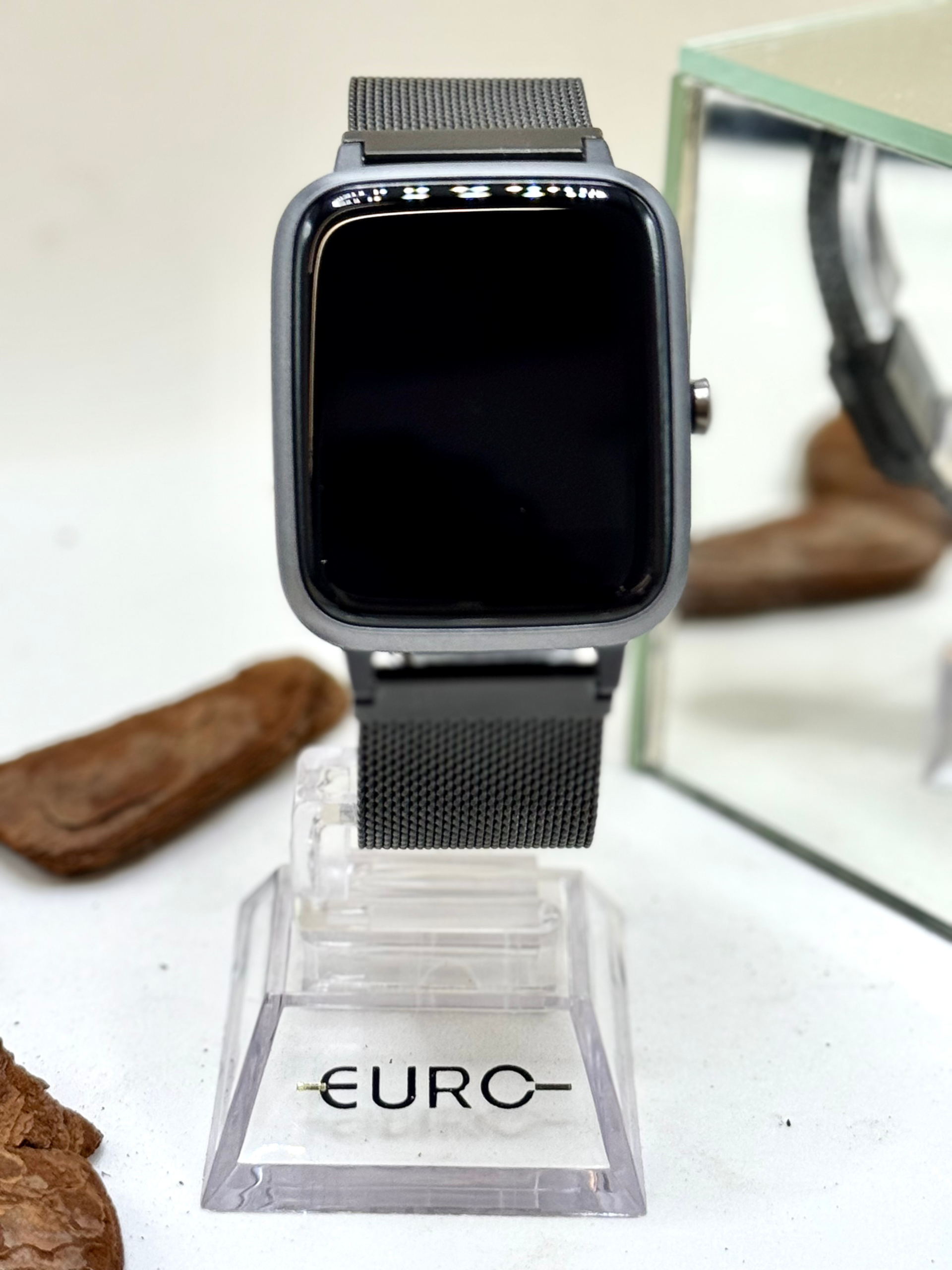 Equipado com display touchscreen full display de 1.3 polegadas, o modelo oferece navegação intuitiva e excelente visualização das informações. A caixa quadrada de 35 mm, em polímero/resina preta, garante leveza e resistência, enquanto a pulseira em aço inoxidável tipo mesh (esteira) na cor preta proporciona ajuste confortável e acabamento elegante.